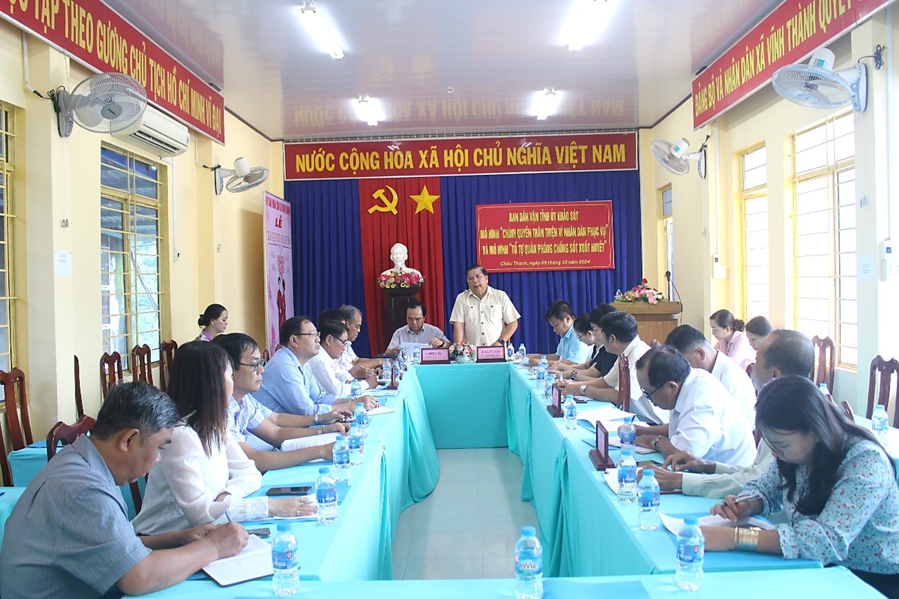 Năm 2024, huyện Châu Thành đã triển khai đăng ký thực hiện 231 mô hình thi đua “Dân vận khéo trên 04 lĩnh vực chính trị, kinh tế, văn hóa - xã hội và quốc phòng - an ninh. Tổng kinh phí ước tính thực hiện 16 tỷ 52 triệu đồng. Tại buổi làm việc, đoàn tiến hành khảo sát thực tế và hướng dẫn thực hiện hiệu quả các mô hình tự quản phòng chống sốt xuất huyết, mô hình chính quyền thân thiện, mô hình đường hoa xóm đẹp xã Vĩnh Thành và mô hình không gian văn hoá Bác Hồ, Bác Tôn trong cơ sở thờ tự (xã Vĩnh Nhuận); Tại đây, đoàn cũng được nghe những thuận lợi và khó khăn của địa phương trong quá trình triển khai thực hiện các mô hình Dân vận khéo trên địa bàn.