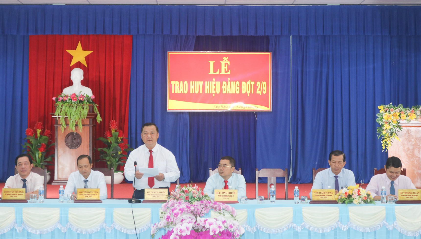 Nhân kỷ niệm 79 năm Ngày Cách mạng tháng 8 và Quốc khánh Nước Cộng hòa xã hội chủ nghĩa Việt Nam (2/9/1945 – 2/9/2024). Đồng thời, ghi nhận và tôn vinh những đảng viên đã có quá trình cống hiến cho sự nghiệp xây dựng Đảng Cộng sản Việt Nam. Sáng ngày 29 – 8 – 2024, Ban Thường vụ Huyện ủy Châu Thành tổ chức Lễ trao tặng Huy hiệu Đảng cho các đảng viên cao niên tuổi Đảng. Tham dự có đồng chí Từ Thanh Khiết – Phó Bí thư Thường trực Huyện ủy - Chủ tịch HĐND huyện.