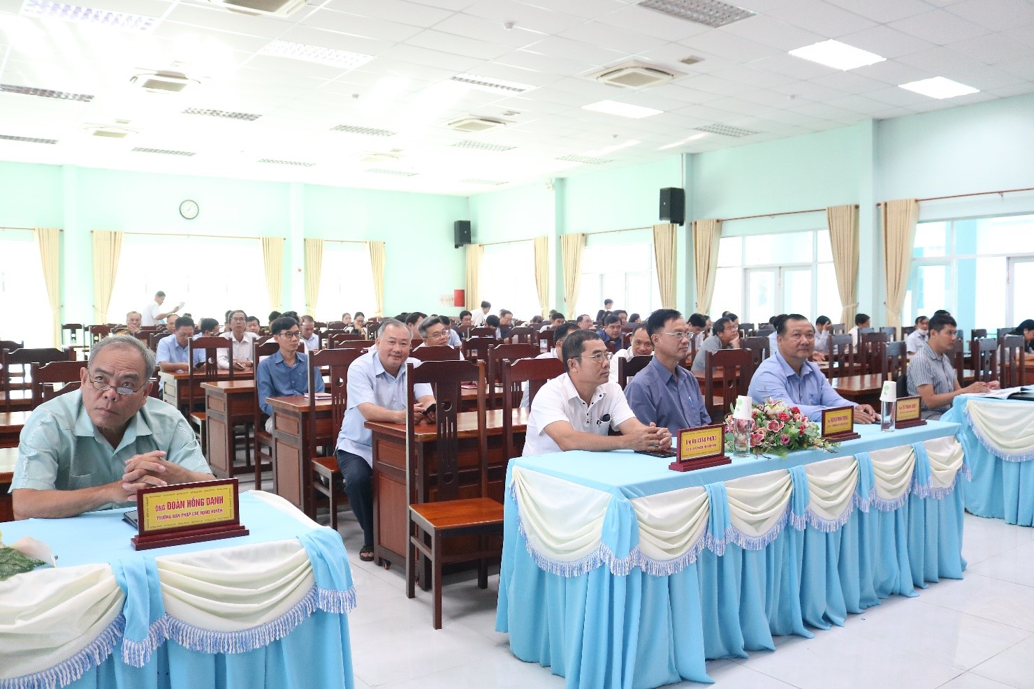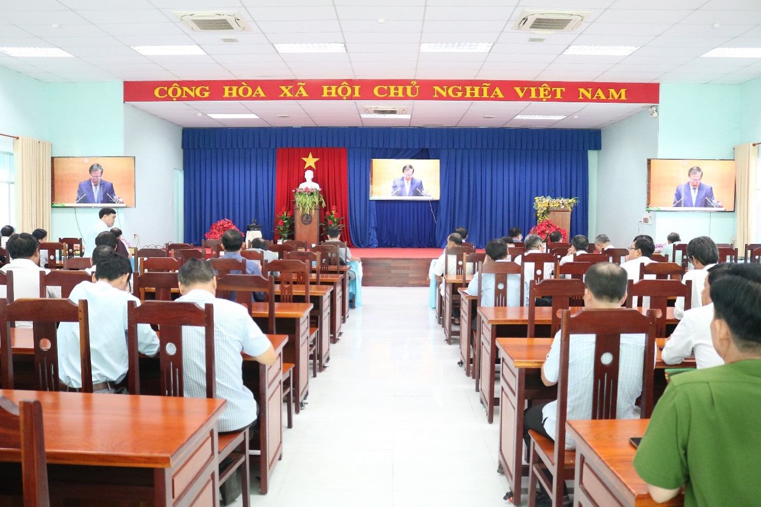 Tại điểm cầu cấp xã, thị trấn có các đồng chí Bí thư, Phó Bí thư Đảng ủy; Chủ tịch, Phó Chủ tịch Hội đồng Nhân dân, Ủy Ban Nhân dân; hiệu trưởng các trường; trưởng, phó Ban, Ngành, Mặt trận Tổ quốc và các tổ chức chính trị - xã hội xã, thị trấn; Bí thư Chi bộ khóm ấp...