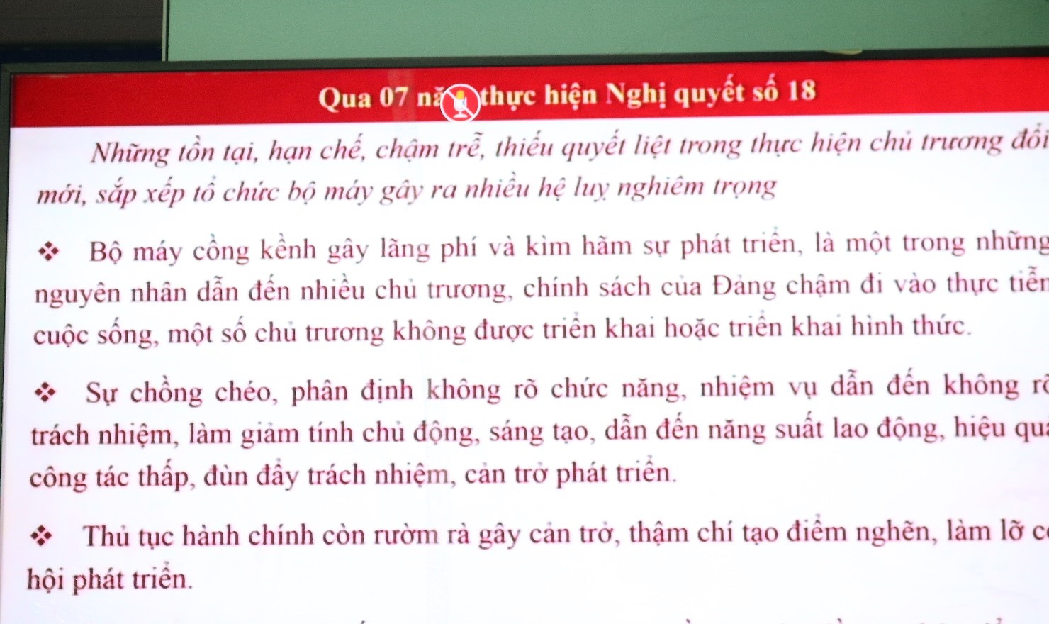 Ngày 01-12-2024, Bộ Chính trị, Ban Bí thư Trung ương Đảng tổ chức Hội nghị toàn quốc quán triệt, triển khai tổng kết việc thực hiện Nghị quyết số 18-NQ/TW của Ban Chấp hành Trung ương Đảng khóa XII; tình hình kinh tế - xã hội năm 2024, giải pháp tăng tốc, phát triển kinh tế - xã hội năm 2025 và tháo gỡ những điểm nghẽn, nút thắt về thể chế.