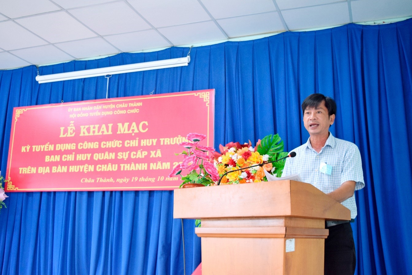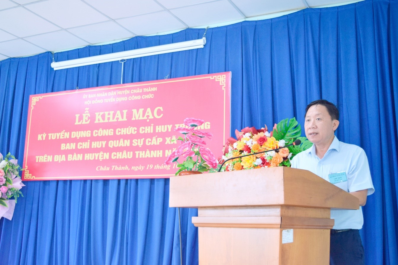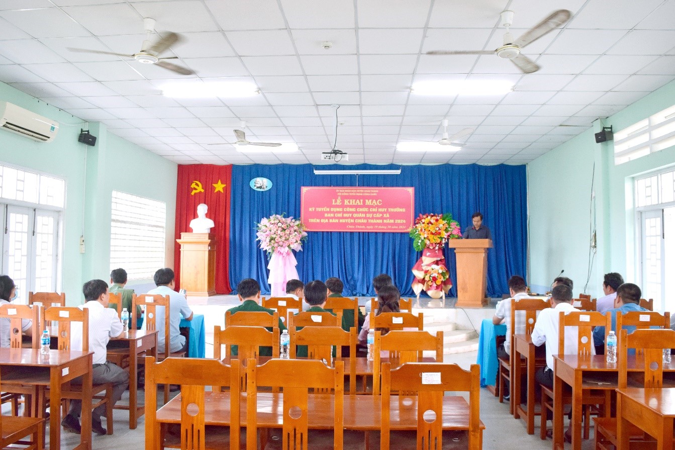 Sáng ngày 19/10/2024, Hội đồng tuyển dụng tổ chức khai mạc kỳ thi tuyển dụng công chức Chỉ huy trưởng Ban Chỉ huy quân sự cấp xã trên địa bàn huyện Châu Thành năm 2024. Tham dự khai mạc có đồng chí Hồ Hữu Tài - Ủy viên Ban thường vụ Huyện ủy - Phó Chủ tịch UBND huyện - Chủ tịch Hội đồng tuyển dụng.và 6 thí sinh đủ điều kiện thi tuyển.