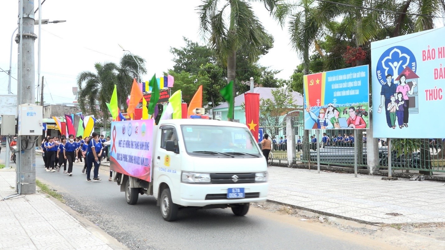 Kết thúc Lễ mít tinh, các lực lượng đã tham gia diễu hành trên các trục đường chính, khu vực chợ, khu vực đông dân cư trên địa bàn xã Bình Hòa với băng rol, khẩu hiệu tuyên truyền cách phòng, chống HIV/AIDS.
