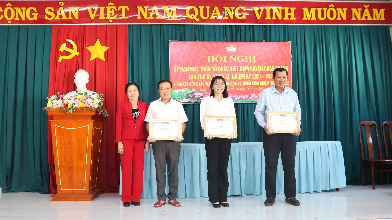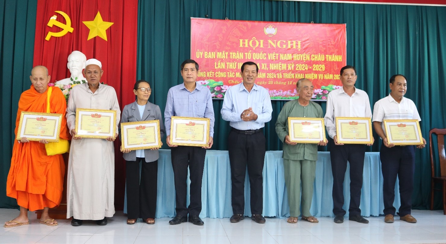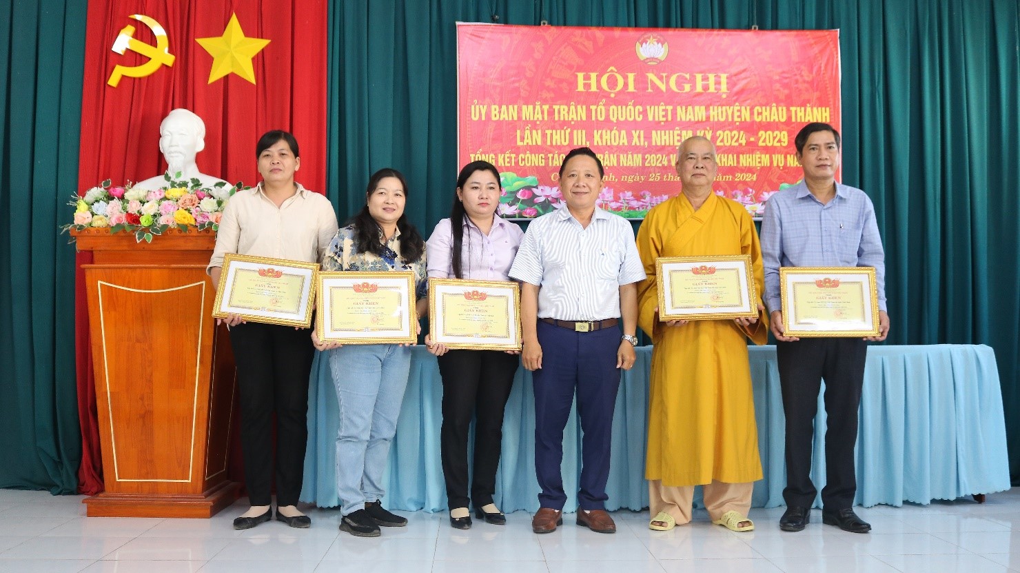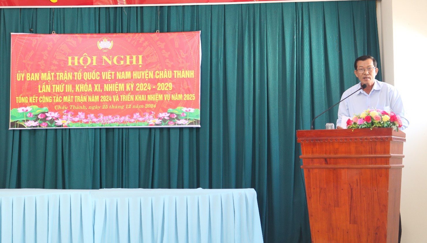 Chiều ngày 25-12-2024, Ủy ban Măt trận Tổ quốc Việt Nam huyện Châu Thành tổ chức Hội nghị Ủy ban Mặt trận Tổ quốc Việt Nam huyện khóa XI, nhiệm kỳ 2024 - 2029 nhằm tổng kết công tác Mặt trận năm 2024 và triển khai định hướng nhiệm vụ, hoạt động trọng tâm công tác Mặt trận năm 2025; hiệp thương cử bổ sung Ủy viên Ủy ban Mặt trận Tổ quốc Việt Nam huyện, nhiệm kỳ 2024 – 2029. Đồng chí Trương Thị Ánh Loan – Uỷ viên Thường trực, Trưởng Ban Tuyên giáo – Phong trào Uỷ ban Mặt trận Tổ quốc Việt Nam tỉnh An Giang; đồng chí Lê Bích Phượng – Tỉnh uỷ viên, Bí thư Huyện uỷ Châu Thành; đồng chí Phan Thành Phương – Uỷ viên Ban thường vụ Huyện uỷ, Chủ tịch Uỷ ban Mặt trận Tổ quốc Việt Nam huyện; đồng chí Hồ Hữu Tài - Uỷ viên Ban thường vụ Huyện uỷ, Phó Chủ tịch Uỷ ban nhân dân huyện Châu Thành cùng đại diện Lãnh đạo các ban xây dựng Đảng; đại diện lãnh đạo phòng, ban, ngành trong huyện; lãnh đạo xã, thị trấn; các đại biểu Ủy viên Ủy ban MTTQ Việt Nam huyện Châu Thành khóa XI về tham dự.