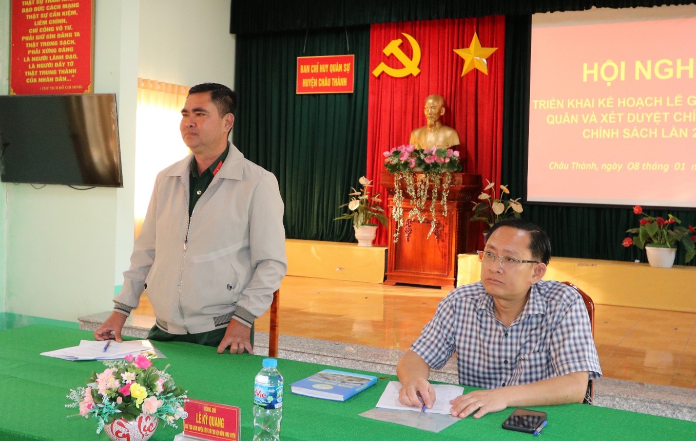 Với tinh thần xét duyệt dân chủ, khách quan, công bằng và đúng luật, Hội đồng Nghĩa vụ Quân sự huyện Châu Thành đã tổ chức xét duyệt chính trị, hồ sơ, phân loại từng công dân được miễn, hoãn và đủ điều kiện thi hành nghĩa vụ quân sự theo đúng quy định. Trong quá trình xét duyệt, ngoài chú trọng những thanh niên có sức khỏe tốt, lý lịch chính trị rõ ràng, Hội đồng Nghĩa vụ Quân sự còn đặc biệt quan tâm những thanh niên có trình độ chuyên môn kỹ thuật, có trình độ tay nghề.