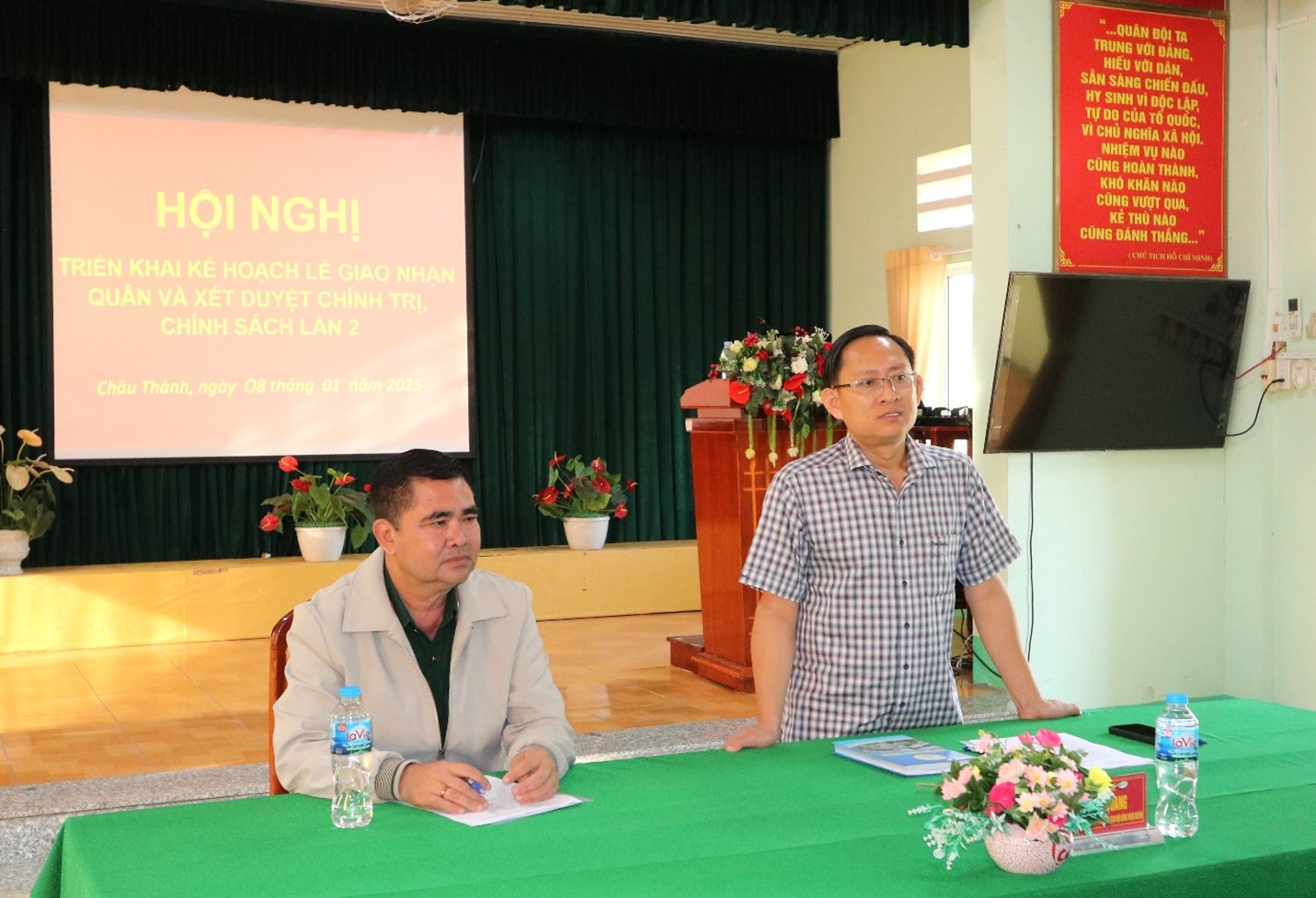 Sáng ngày 08-01-2025, Hội đồng Nghĩa vụ Quân sự huyện Châu Thành đã tổ chức Hội nghị triển khai Kế hoạch tổ chức Lễ giao, nhận quân và xét duyệt chính trị, chính sách lần 2, năm 2025. Đồng chí Lê Kỳ Quang - Phó Bí thư Huyện ủy, Chủ tịch UBND huyện, Chủ tịch Hội đồng Nghĩa vụ Quân sự huyện chủ trì Hội nghị. Cùng dự có các đồng chí thành viên Hội đồng Nghĩa vụ Quân sự huyện, các đồng chí thành viên Ban Tổ chức Lễ giao, nhận quân.