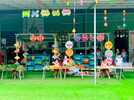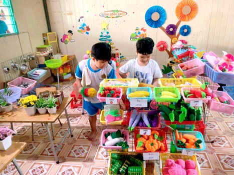 Với phong trào “Xây dựng trường học thân thiện, học sinh tích cực”, cán bộ, giáo viên nhà trường tích cực sáng tạo trong việc làm đồ dùng, đồ chơi ứng dụng vào giảng dạy và phục vụ hoạt động của trẻ. Nhờ sự khéo léo, các cô giáo đã biến những vật dụng như: lốp xe, chai lọ, bìa carton thành những đồ dùng dạy học hữu ích. Thực hiện lời Bác dạy, công tác chăm sóc sức khỏe của các cháu học sinh được nhà trường thực hiện song song với việc giáo dục trẻ. Ngoài việc hàng năm 100% trẻ được cân đo, theo dõi biểu đồ tăng trưởng thì đội ngũ nhân viên nuôi dưỡng luôn thực hiện nghiêm túc nội quy bếp ăn, bảo đảm vệ sinh an toàn thực phẩm. Thực đơn mỗi ngày của trẻ được thay đổi thường xuyên và niêm yết công khai tại bảng tin của nhà trường.