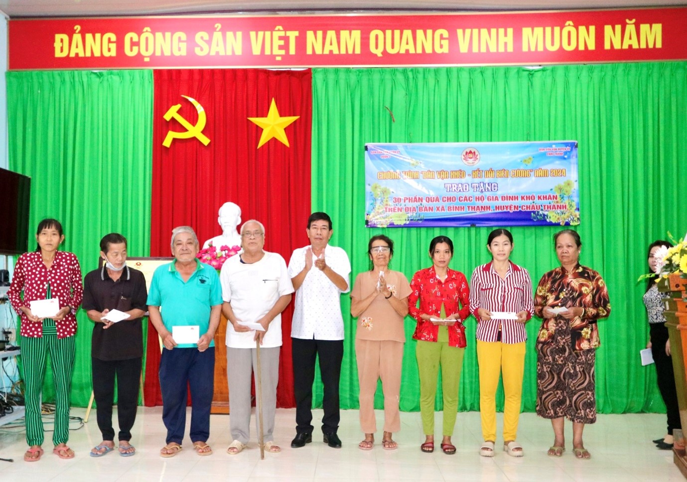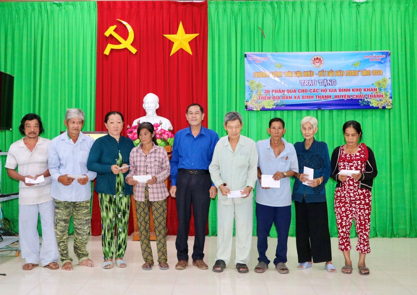 Theo đó, Ban Dân vận Huyện ủy đã trao 30 phần quà cho các hộ gia đình khó khăn trên địa bàn xã Bình Thạnh; mỗi phần bao gồm tiền mặt trị giá 500.000 đồng. Tổng giá trị 15.000.000 đồng. Đây là những phần quà ý nghĩa, góp phần cùng chính quyền địa phương chăm lo cuộc sống của Nhân dân, cũng như tiếp thêm niềm tin và nghị lực cho hộ khó khăn vươn lên trong cuộc sống.