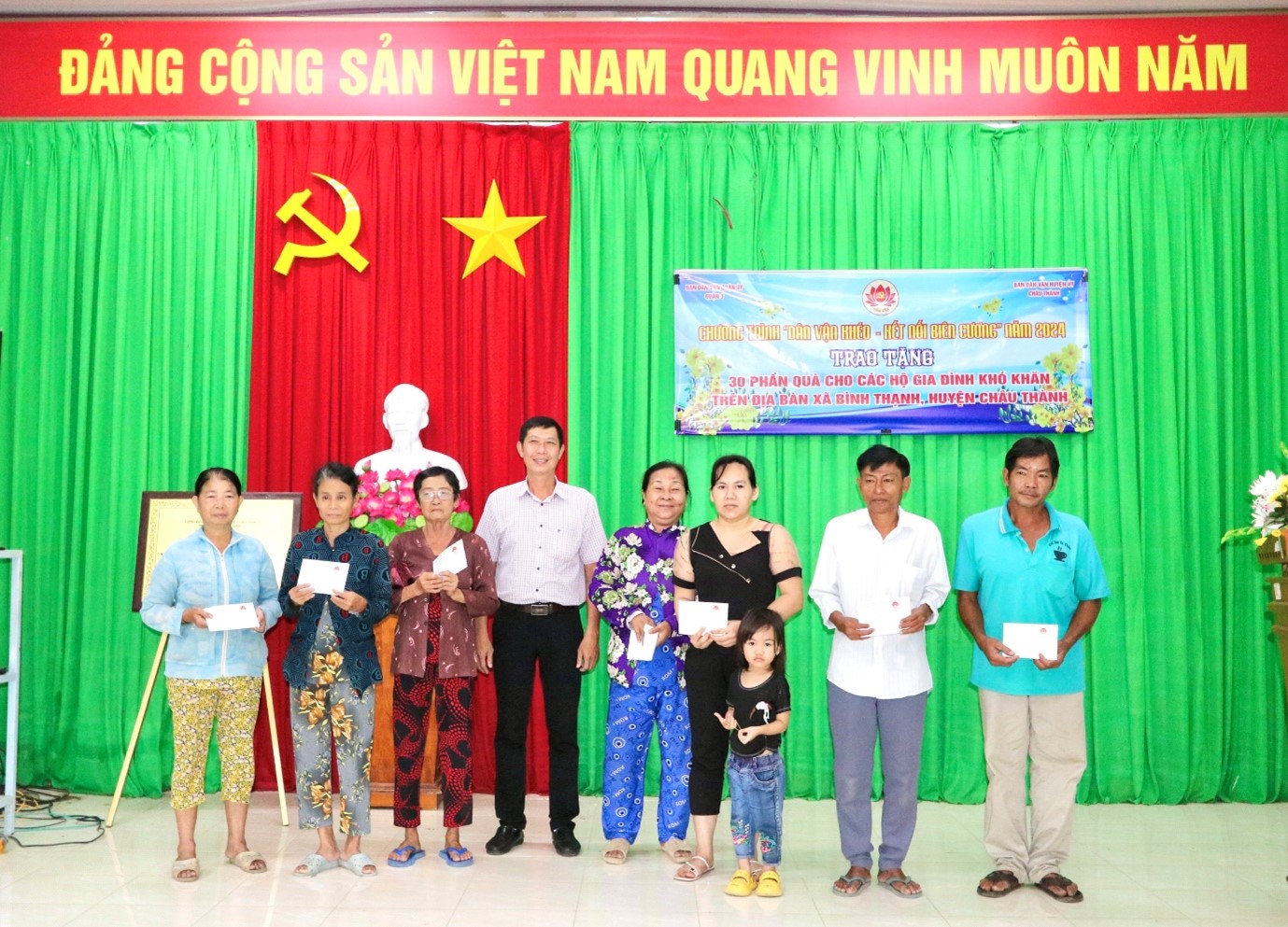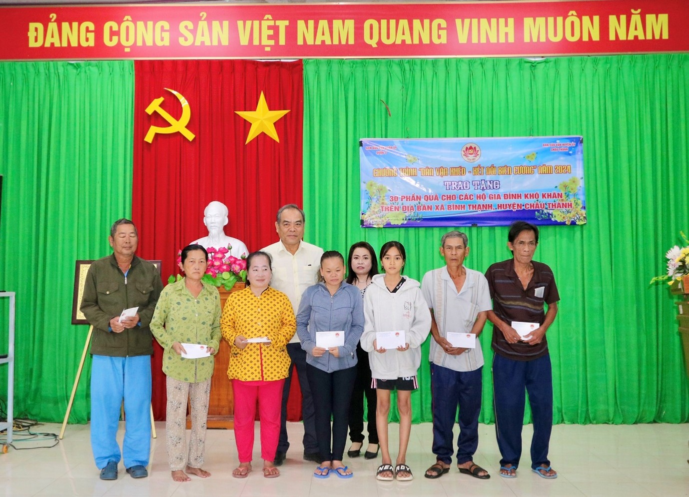Trong khuôn khổ Chương trình “Dân vận khéo - Kết nối biên cương” do Ban Dân vận quận ủy Quận 3, thành phố Hồ Chí Minh phát động; Sáng ngày 03-01-2025, tại UBND xã Bình Thạnh, Ban Dân vận Huyện ủy Châu Thành tổ chức buổi trao tặng quà cho các hộ gia đình khó khăn trên địa bàn xã Bình Thạnh. Đến dự Chương trình có đồng chí Đoàn Hồng Danh - Ủy viên Ban Thường vụ Huyện ủy, Trưởng Ban Dân vận Huyện ủy; Đồng chí Lê Thanh Hà - Phó trưởng Ban Dân vận Huyện ủy; Đồng chí Bùi Thanh Bình - Bí thư Đảng ủy xã.