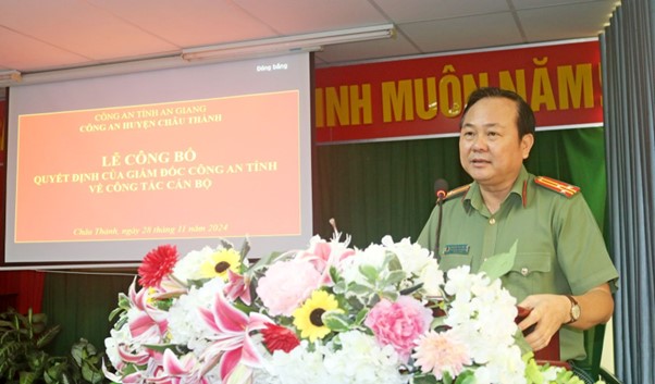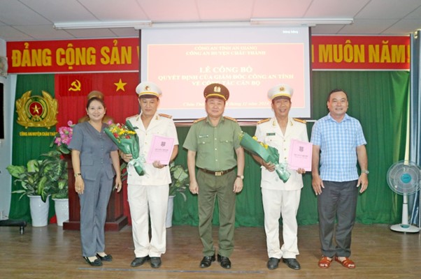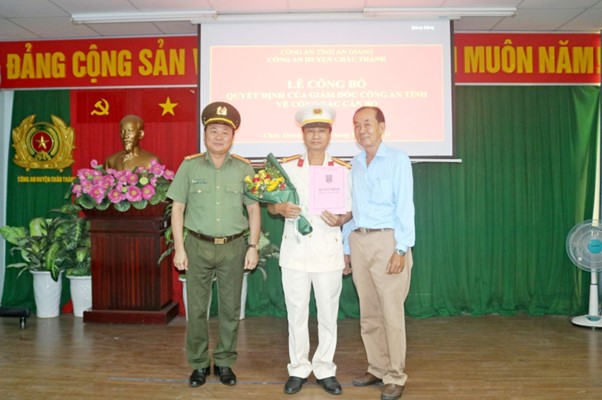 Tại buổi Lễ, lãnh đạo Đội Tham mưu, Công an huyện đã thông báo Quyết định của Giám đốc Công an tỉnh về việc điều động và bổ nhiệm có thời hạn đồng chí Trung tá Uông Thành Song - Phó Trưởng Công an xã Vĩnh Thành, đến nhận công tác và giữ chức vụ Trưởng Công an xã Vĩnh An; Điều động đồng chí Trung tá Phan Văn Đà - Đội trưởng Đội Cảnh sát thi hành án hình sự và hỗ trợ tư pháp - Công an huyện Châu Thành, đến nhận công tác và giữ chức vụ Trưởng Công an xã Vĩnh Lợi; Điều động đồng chí Trung tá Nguyễn Tấn Đại - Đội trưởng Đội Cảnh sát quản lý hành chính về trật tự xã hội - Công an huyện Châu Thành, đến nhận công tác và giữ chức vụ Trưởng Công an xã Tân Phú; Điều động đồng chí Trung tá Nguyễn Khang - Trưởng Công an xã Vĩnh An - Công an huyện Châu Thành, đến nhận công tác và giữ chức vụ Đội trưởng Đội Cảnh sát thi hành án hình sự và hỗ trợ tư pháp - Công an huyện Châu Thành thuộc Công an tỉnh An Giang; Điều động đồng chí Thiếu tá Lê Văn Phố - Trưởng Công an xã Vĩnh Lợi, đến nhận công tác và giữ chức vụ Đội trưởng Đội Cảnh sát quản lý hành chính về trật tự xã hội - Công an huyện Châu Thành thuộc Công an tỉnh An Giang.