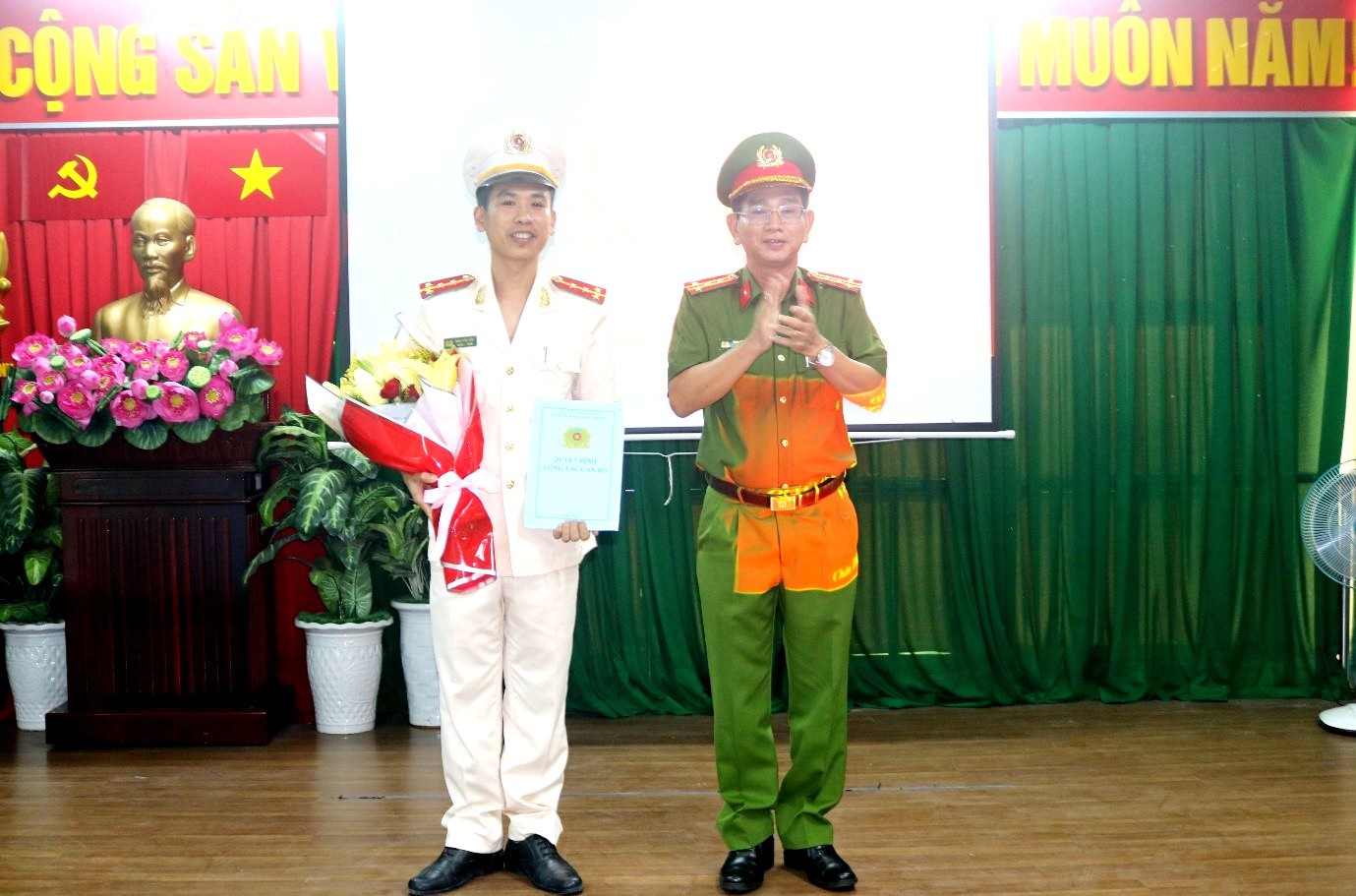 Đại tá Trần Văn Cung - Phó Giám đốc Công an tỉnh trao Quyết định của Giám đốc Công an tỉnh bổ nhiệm có thời hạn đồng chí Đại úy Phan Hữu Hiệp.