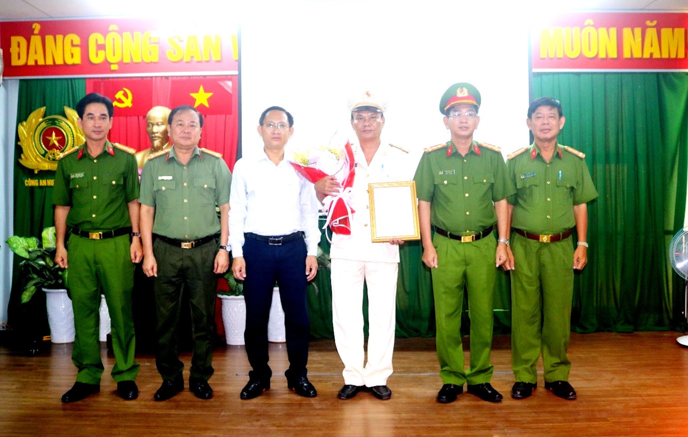 Thượng tá Trần Tấn Tài cùng lãnh đạo Công an tỉnh, lãnh đạo Ủy ban Nhân dân huyện và lãnh đạo Công an huyện.