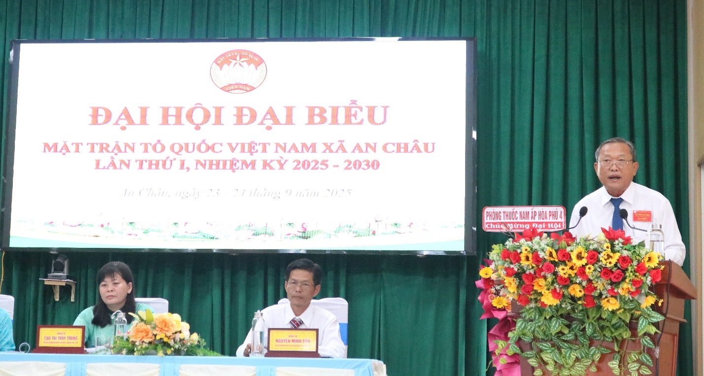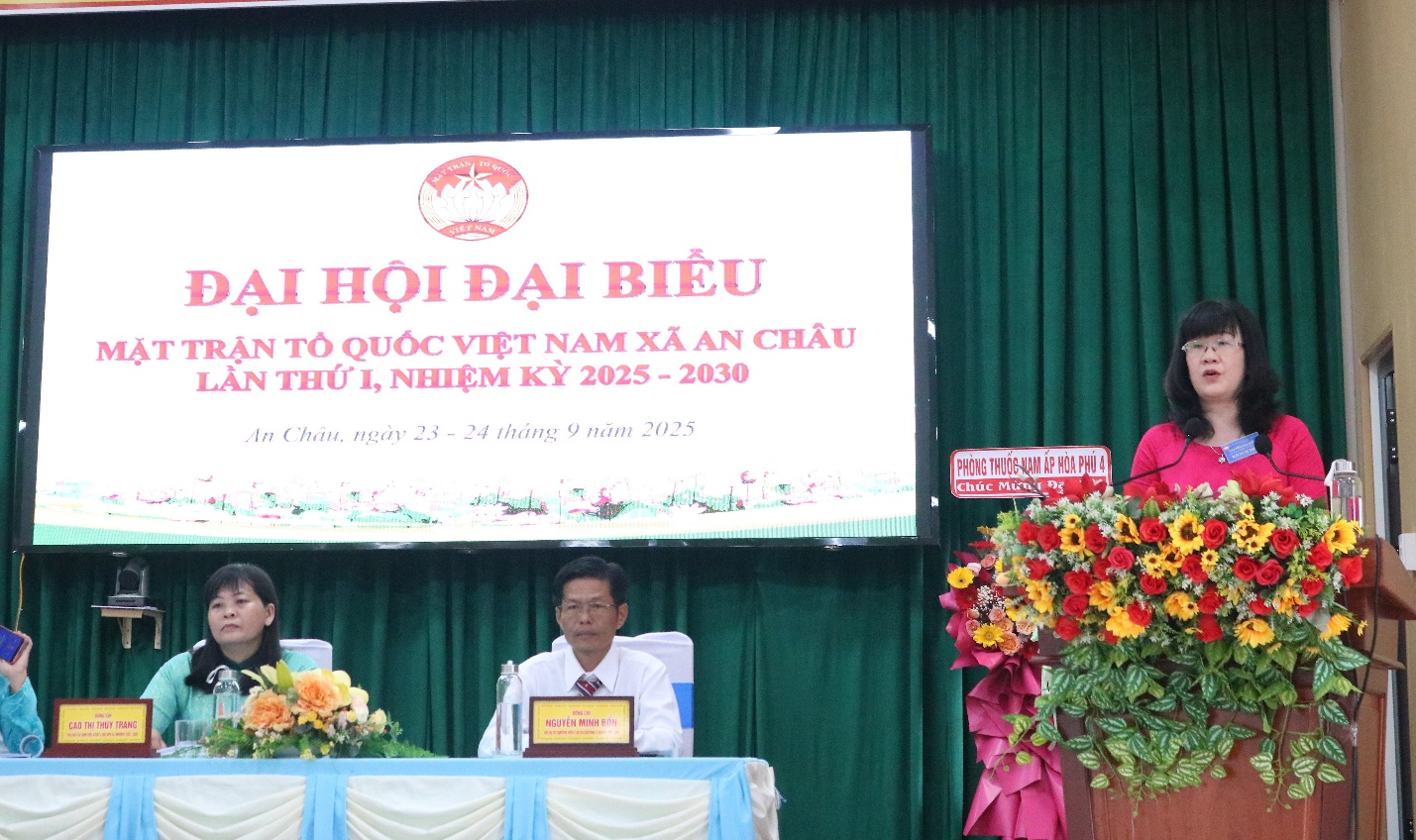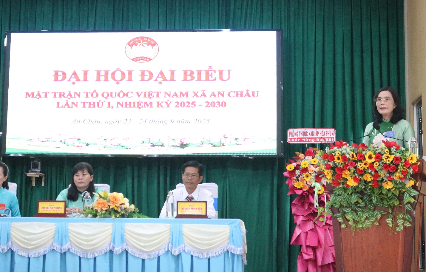 Phát biểu tại đại hội, bà Hà Minh Trang - Phó Chủ tịch UBMTTQVN tỉnh An Giang đánh giá cao kết quả Mặt trận tổ quốc xã An Châu đạt được trong nhiệm kỳ qua. Đồng chí đề nghị Mặt trận xã cùng với các thành viên tiếp tục phát huy sức mạnh đoàn kết thực hiện tốt công tác tuyên truyền, vận động nhân dân thực hiện tốt, chủ trương, chính sách pháp luật của Đảng, nhà nước; đẩy mạnh việc học tập và làm tư tưởng, đạo đức, phong cách Hồ Chí Minh; vận động nhân dân tích cực tham gia các phong trào thi đua yêu nước tại địa phương; củng cố, tăng cường hoạt động Ban Thanh tra nhân dân và Ban giám sát đầu tư cộng đồng; phát huy quyền làm chủ của nhân dân, chủ động, tích cực tham gia xây dựng Đảng, chính quyền trong sạch, vững mạnh …góp phần xây dựng xã An Châu phát triển vững mạnh.