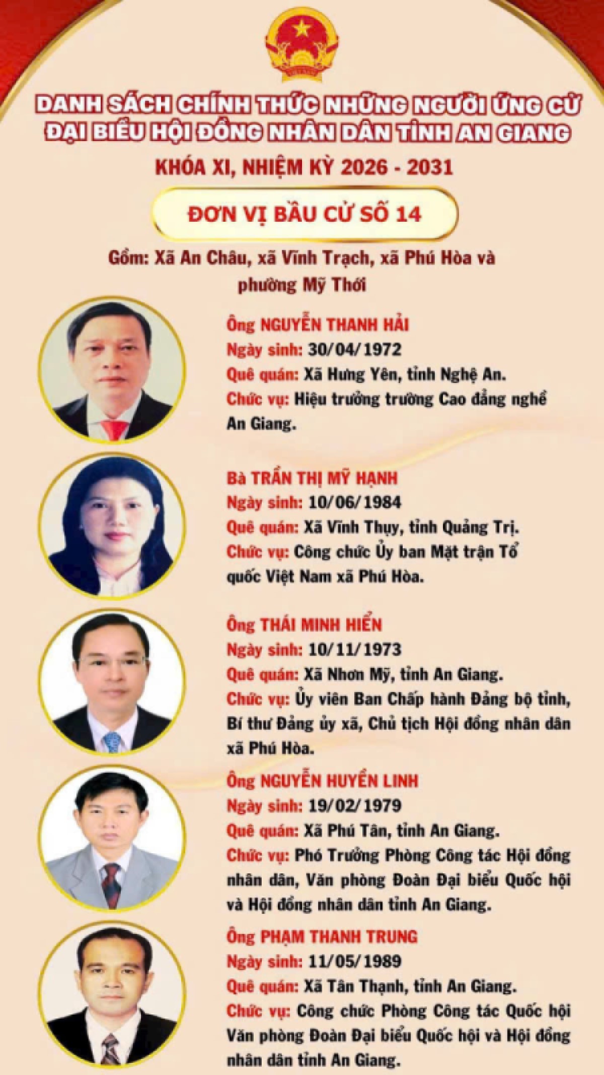 Danh sách chính thức những người ứng cử đại biểu HĐND tỉnh, Khóa XI, nhiệm kỳ 2026-2031, đơn vị bầu cử số 14