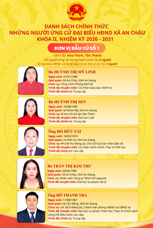 Danh sách chính thức những người ứng cử Đại biểu HĐND xã An Châu, Khóa II, nhiệm kỳ 2026-2031 đơn vị bầu cử số 7