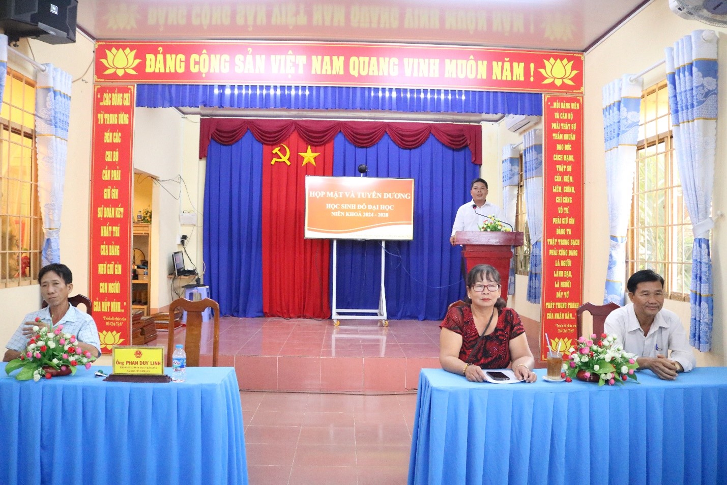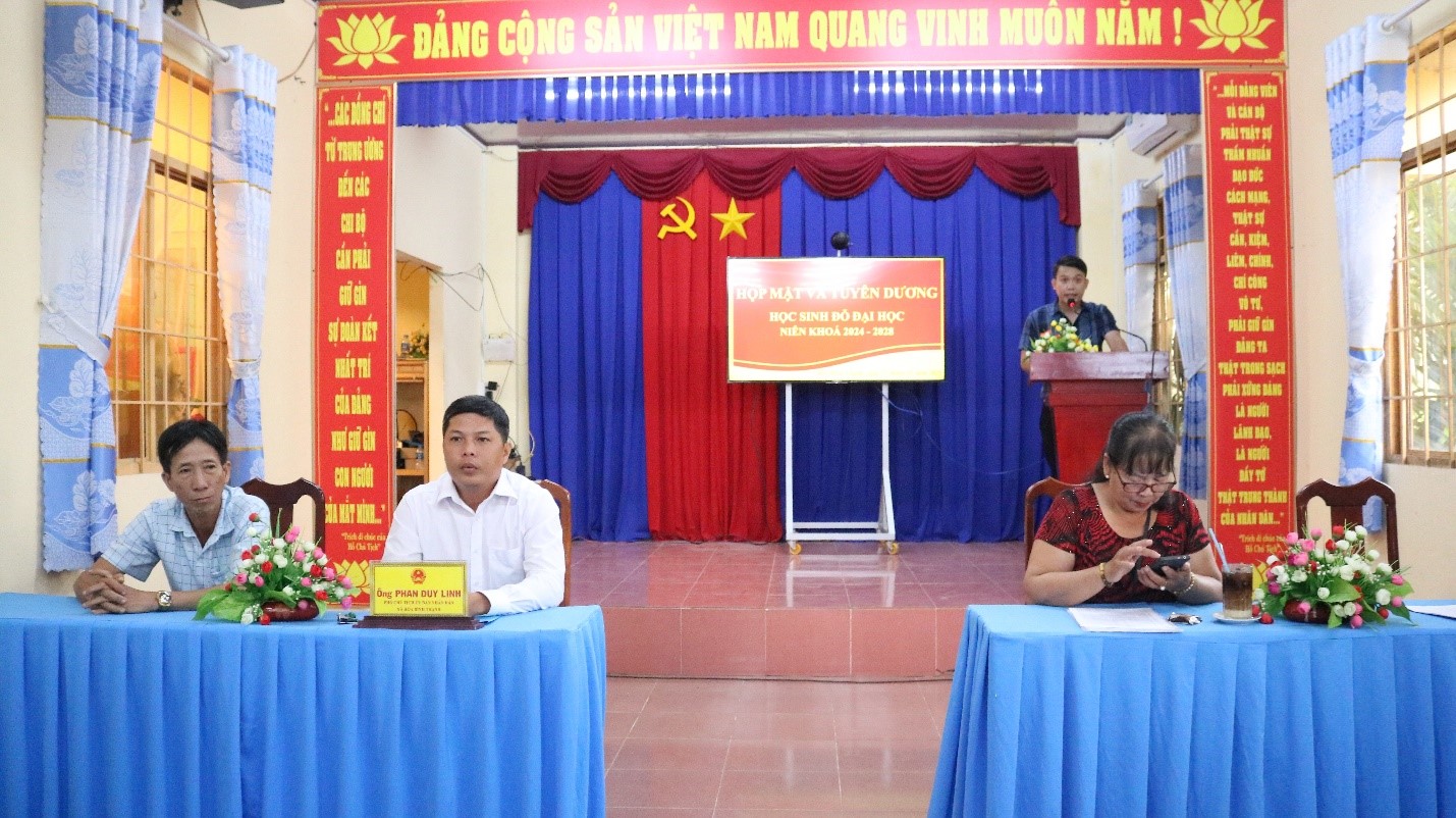 Em Nguyễn Thị Lan Thanh chia sẻ “em rất vui và rất vinh dự khi được đại diện cho các bạn tân sinh viên tham buổi họp mặt và tuyên dương ngày hôm nay. Em rất cám ơn sự quan tâm, chia sẻ từ các cô chú lãnh đạo địa phương, kỷ niệm ngày hôm nay sẽ là động lực để chúng em nuôi dưỡng ước mơ học tập trên giảng đường đại học, em và các bạn hứa sẽ nỗ lực hết mình, cố gắng học tập để xây dựng tương lai sau này góp một phần nhỏ công sức xây dựng quê hương…”