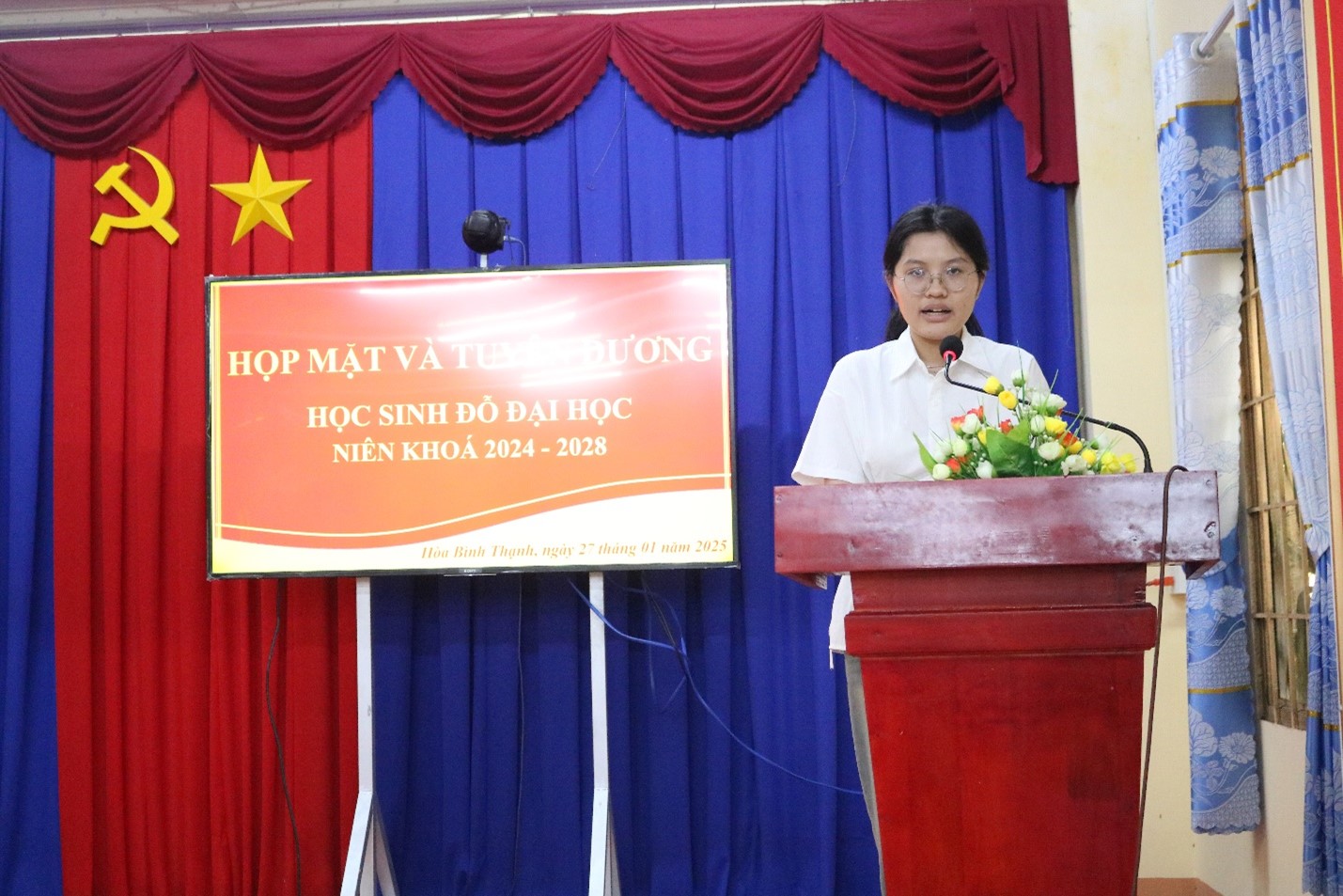 Phát biểu tại lễ tuyên dương, ông Phan Duy Linh – Phó Chủ tịch Ủy ban nhân dân xã Hòa Bình Thạnh biểu dương những cố gắng học tập của các em, mong rằng, các em tân sinh viên sẽ nỗ lực, vượt qua khó khăn trong học tập, có những trải nghiệm mới trên giảng đường đại học, tích lũy kiến thức, kinh nghiệm, trở thành những thanh niên ưu tú của xã nhà.