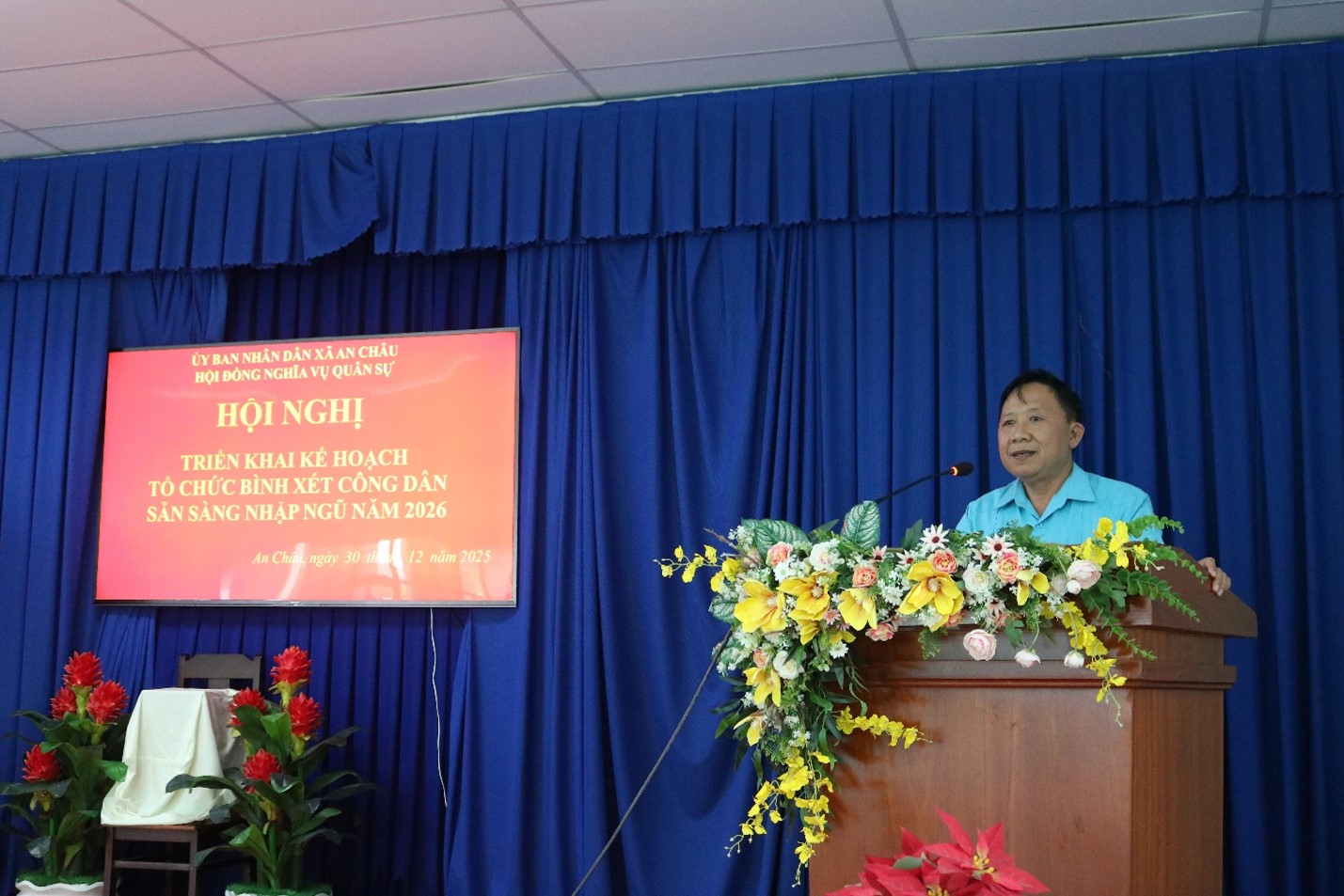 Ngày 30-12-2026, Hội đồng nghĩa vụ quân sự xã An Châu tổ chức hội nghị triển khai kế hoạch tổ chức bình xét công dân sẵn sàng nhập ngũ năm 2026. Ông Hồ Hữu Tài – Phó Bí thư Đảng ủy, Chủ tịch UBND xã, Chủ tịch Hội đồng nghĩa vụ quân sự xã chủ trì hội nghị; cùng các thành viên Hội đồng tham dự.