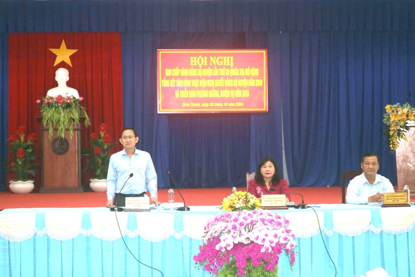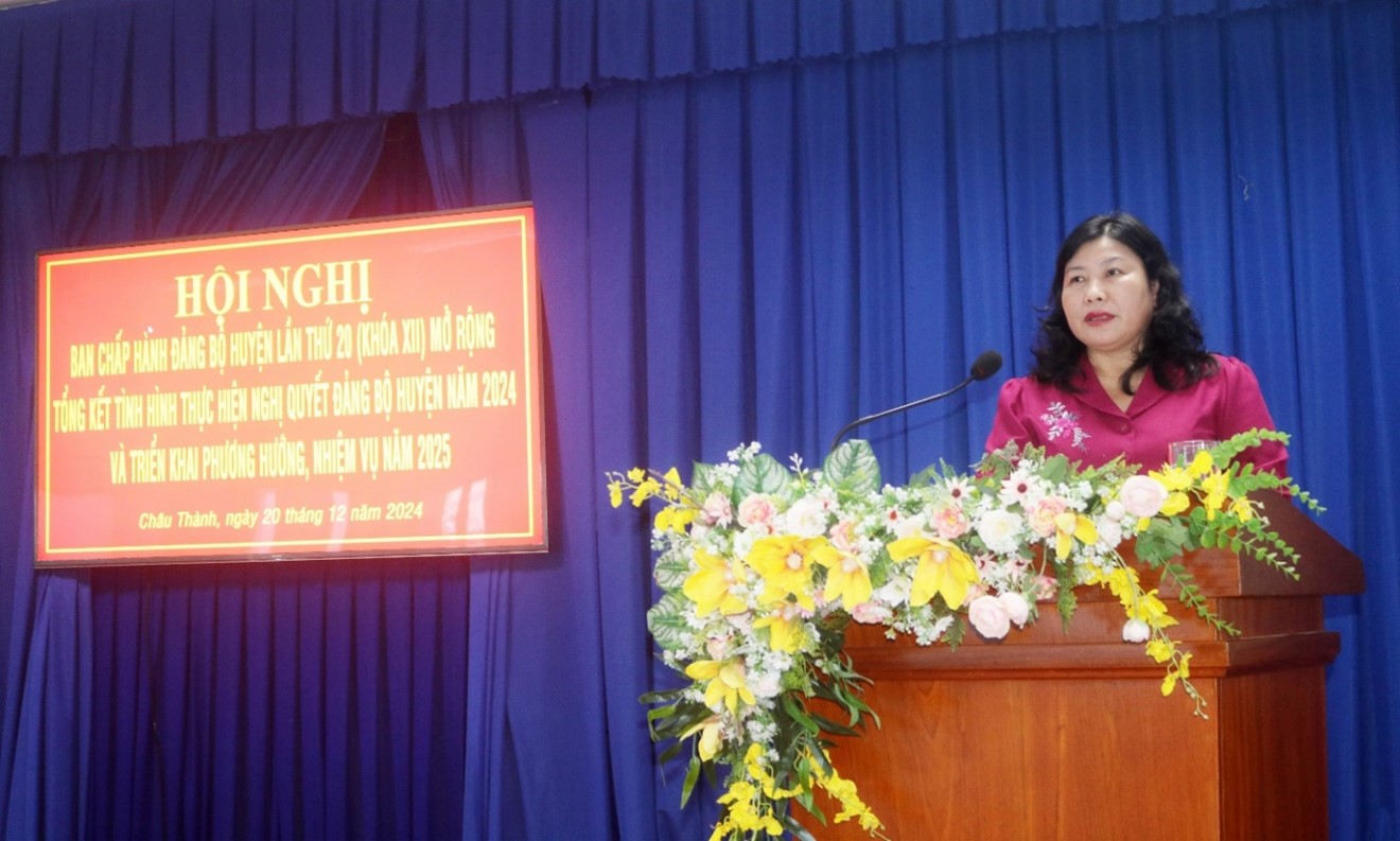 Chiều ngày 20-12-2024, Huyện ủy Châu Thành tổ chức Hội nghị Ban Chấp hành Đảng bộ huyện Châu Thành lần thứ 20 (khóa XII), nhằm tổng kết tình hình thực hiện nhiệm vụ chính trị năm 2024 và đề ra phương hướng, nhiệm vụ năm 2025. Đồng chí Lê Bích Phượng - Tỉnh ủy viên, Bí thư Huyện ủy chủ trì Hội nghị. Cùng dự có đồng chí Từ Thanh Khiết - Phó Bí thư Thường trực Huyện ủy, Chủ tịch HĐND huyện; đồng chí Lê Kỳ Quang - Phó Bí thư Huyện ủy, Chủ tịch UBND huyện.