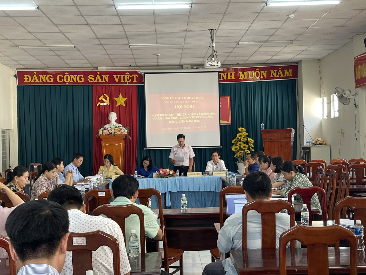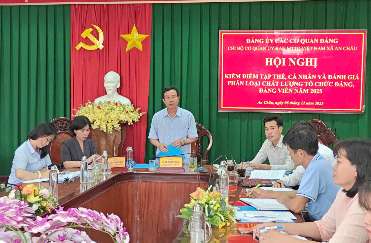 Trong các ngày 05, 06/12/2025, Chi bộ Ban Xây dựng Đảng và Chi bộ Cơ quan UBMTTQ Việt Nam xã An Châu tổ chức Hội nghị kiểm điểm tập thể, cá nhân và đánh giá, phân loại chất lượng tổ chức đảng, đảng viên năm 2025.