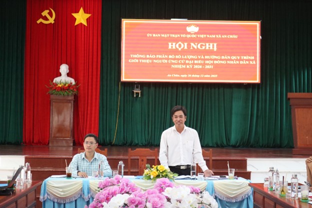 Ngày 26-12-2025, Ủy ban MTTQ Việt Nam xã An Châu tổ chức Hội nghị thông báo phân bổ số lượng và hướng dẫn quy trình giới thiệu người ứng cử Đại biểu HĐND xã nhiệm kỳ 2026-2031. Đồng chí Trương Thành Trung – UVBTV Đảng ủy, Phó Chủ tịch HĐND xã; đồng chí Nguyễn Ngọc Đến – Đảng ủy viên, Phó Chủ tịch Thường trực Ủy ban MTTQ Việt Nam, Chủ tịch Hội Nông dân xã An Châu chủ trì hội nghị; cùng lãnh đạo các cơ quan tham mưu giúp việc Đảng ủy, các cơ quan chuyên chuyên môn và tổ chức hành chính, đơn vị sự nghiệp thuộc Uỷ ban nhân dân xã, công an, quân sự; Trưởng Ban công tác mặt trận các ấp.