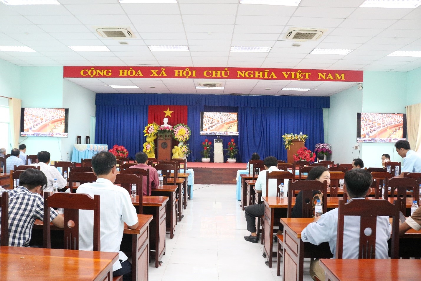 Tại điểm cầu Nhà Quốc hội, tham dự hội nghị có các đồng chí Tổng Bí thư Tô Lâm; Chủ tịch nước Lương Cường; Thủ tướng Chính phủ Phạm Minh Chính; Ủy viên Bộ Chính trị, Chủ tịch Quốc hội Trần Thanh Mẫn - Chủ tịch Hội đồng Bầu cử quốc gia; Ủy viên Bộ Chính trị, Thường trực Ban Bí thư Trần Cẩm Tú; Ủy viên Bộ Chính trị, Phó Chủ tịch Thường trực Quốc hội, Phó Chủ tịch Thường trực Hội đồng Bầu cử quốc gia Đỗ Văn Chiến.