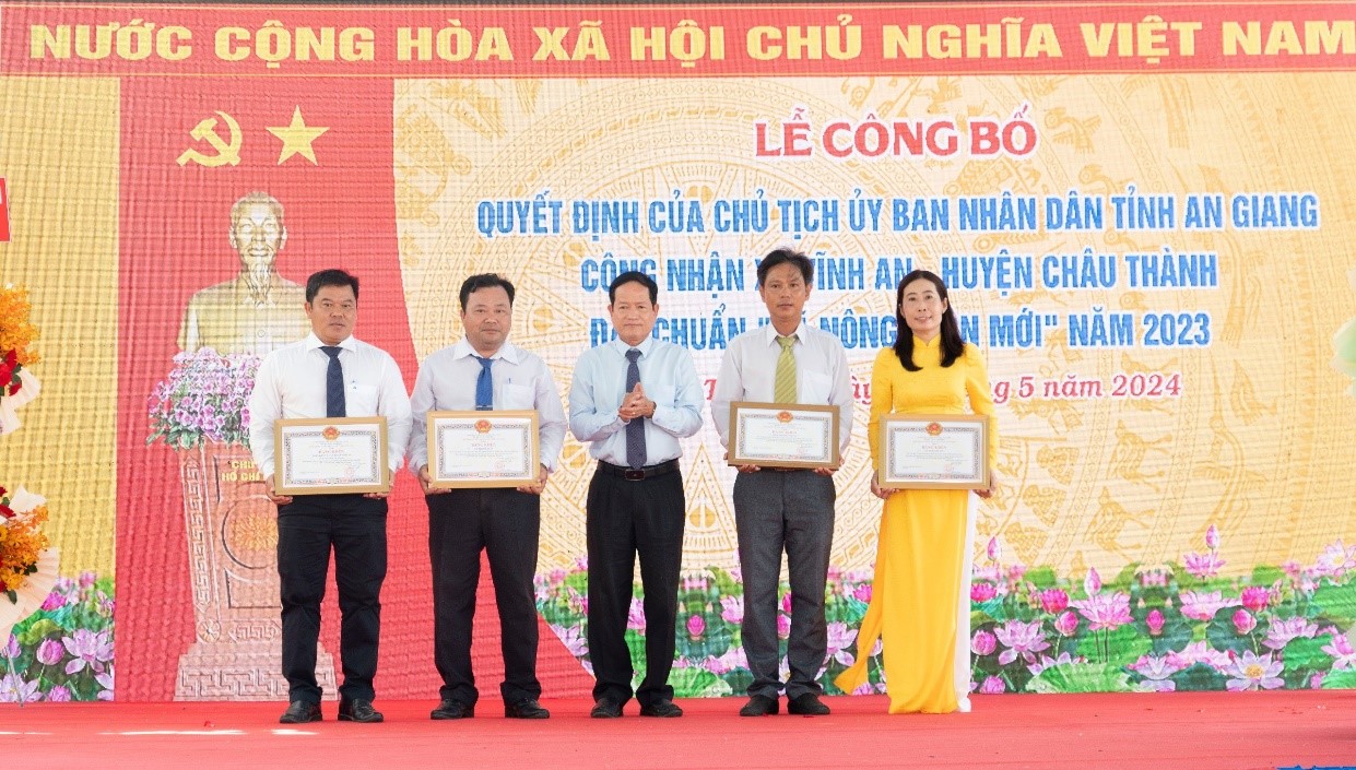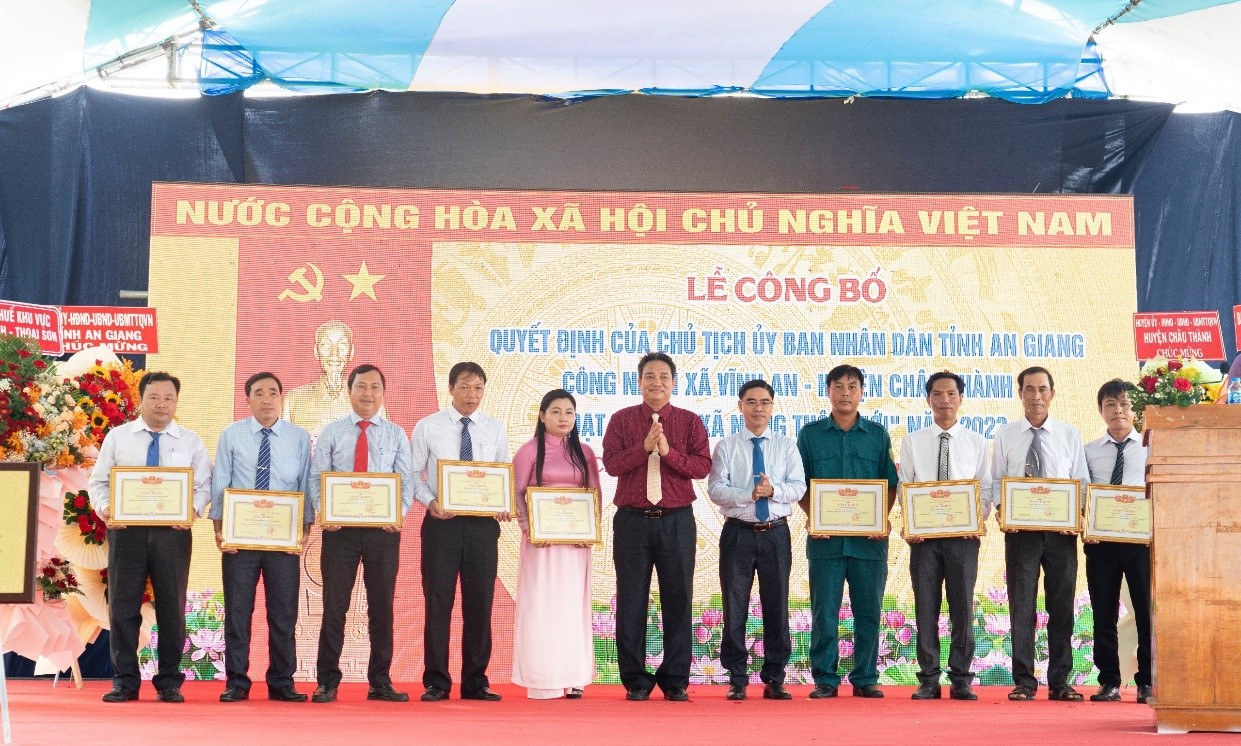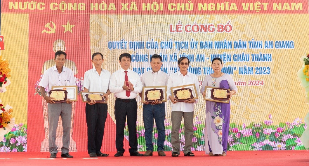 Dịp này, UBND tỉnh An Giang đã trao bằng khen và logo cho các tập thể và cá nhân; UBND huyện Châu Thành và UBND xã Vĩnh An cũng khen thưởng cho các tập thể và cá nhân vì có thành tích đóng góp xây dựng xã Vĩnh An đạt chuẩn xã Nông thôn mới./.