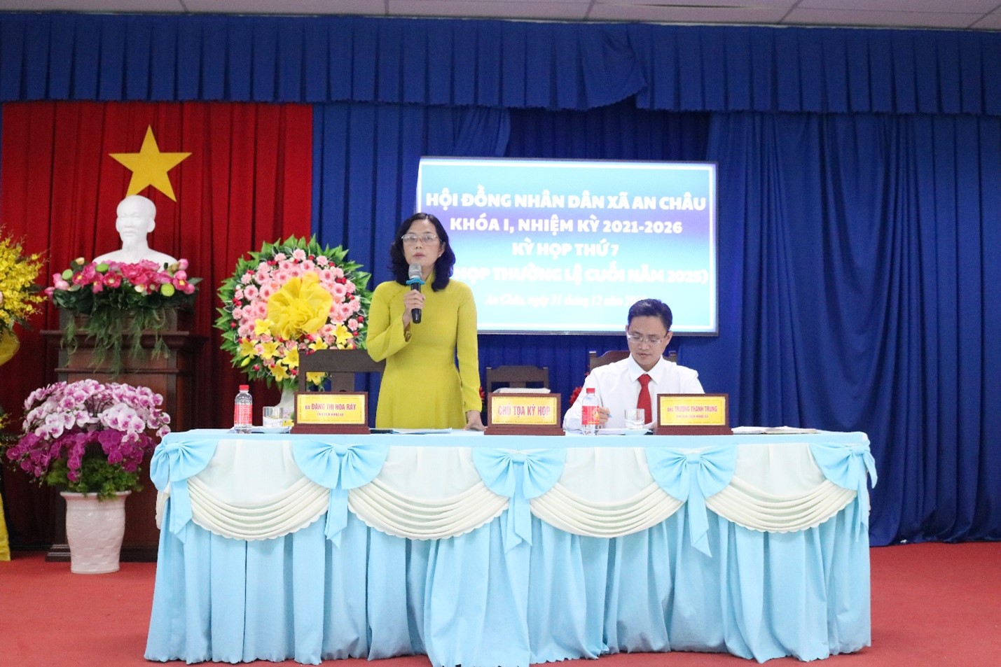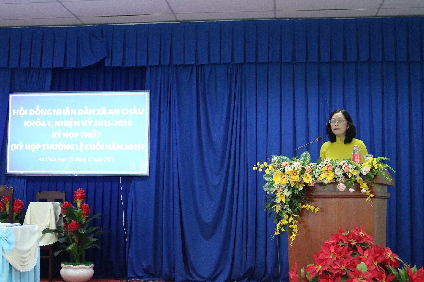 Phát biểu tại kỳ họp, đồng chí Đặng Thị Hoa Rây – Tỉnh ủy viên, Bí thư Đảng ủy, Chủ tịch Hội đồng nhân dân xã đề nghị Ủy ban nhân dân xã khẩn trương xây dựng kế hoạch triển khai thực hiện; các Ban, Tổ đại biểu và từng đại biểu Hội đồng nhân dân xã tiếp tục phát huy vai trò giám sát; Ủy ban Mặt trận Tổ quốc Việt Nam xã và các tổ chức chính trị – xã hội tăng cường tuyên truyền, vận động Nhân dân đồng thuận, tích cực tham gia thực hiện nghị quyết. Với truyền thống đoàn kết, tinh thần trách nhiệm và quyết tâm chính trị cao, tôi tin tưởng rằng xã An Châu sẽ tiếp tục phát huy những kết quả đạt được của nhiệm kỳ 2021 – 2026, thực hiện thắng lợi các mục tiêu, nhiệm vụ đã đề ra, tạo tiền đề vững chắc cho nhiệm kỳ Hội đồng nhân dân xã tiếp theo.