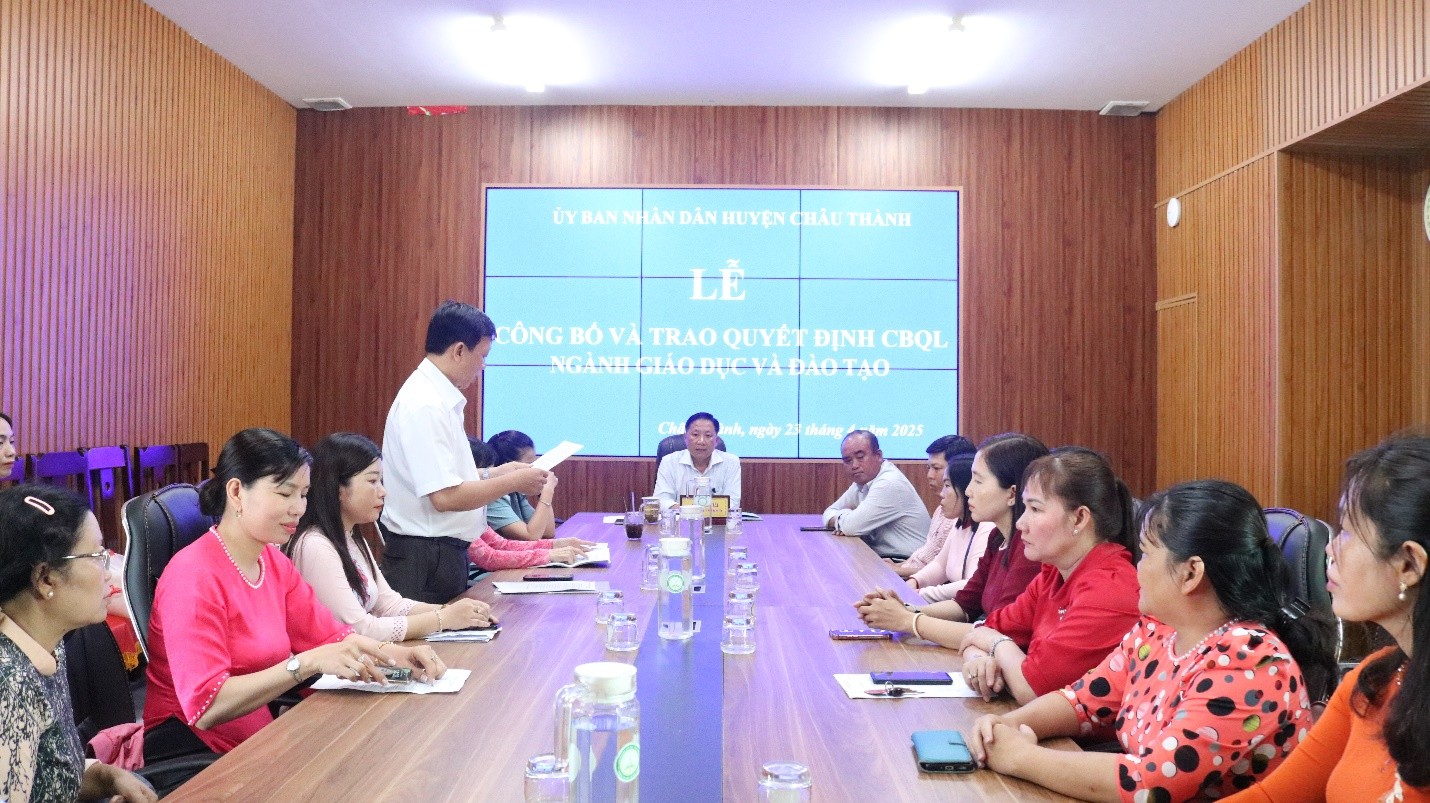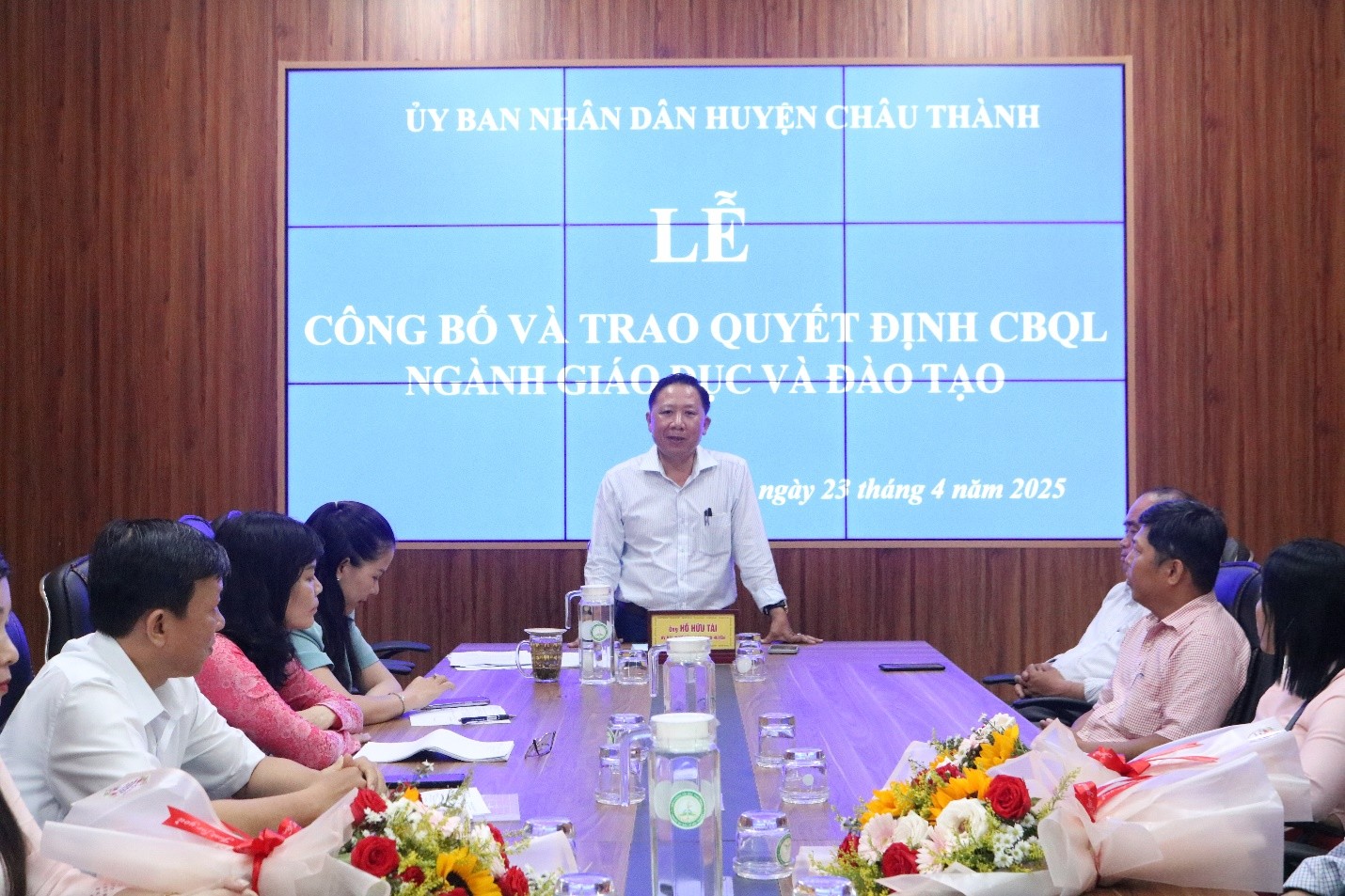 Chiều ngày 23-04-2025, Ủy ban nhân dân huyện Châu Thành tổ chức lễ công bố và trao quyết định cán bộ quản lý ngành giáo dục. Ông Hồ Hữu Tài - Ủy viên Ban Thường vụ Huyện ủy, Phó Chủ tịch Ủy ban nhân dân huyện; bà Huỳnh Thị Thanh Tuyền – Huyện ủy viên, Trưởng Phòng Giáo dục và Đào tạo huyện đã đến dự.