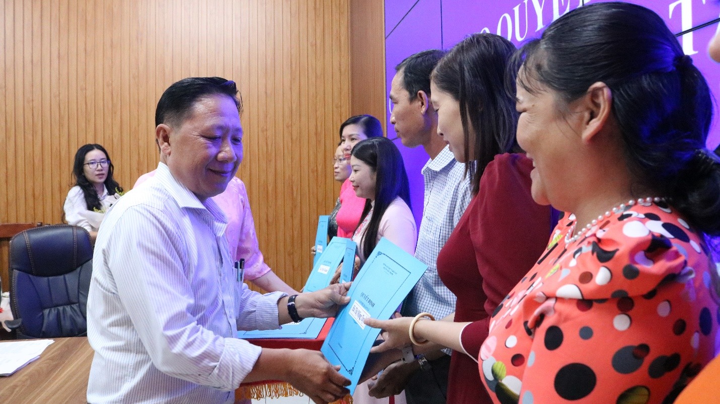 Tại buổi lễ, lãnh đạo Ủy ban nhân dân huyện đã trao quyết định bổ nhiệm lại đối với 07 cán bộ quản lý là Hiệu trưởng, Phó hiệu trưởng các trường Mẫu giáo trên địa bàn huyện, thời hạn bổ nhiệm là 5 năm. Cụ thể, bổ nhiệm lại bà Hà Thị Nguyệt, giữ chức vụ Hiệu Trưởng Trường Mẫu giáo Hòa Bình Thạnh; bổ nhiệm lại bà Tạ Thị Xuân, giữ chức vụ Hiệu Trưởng Trường Mẫu giáo Vĩnh Hanh; bổ nhiệm lại bà Nguyễn Thị Kim Chi, giữ chức vụ Phó Hiệu trưởng Trường Mẫu giáo An Hòa; bổ nhiệm lại bà Nguyễn Thị Bé Mười, giữ chức vụ Phó Hiệu trưởng Trường Mẫu giáo Vĩnh Hanh; bổ nhiệm lại bà Hà Thị Mộng Tuyền, giữ chức vụ Phó Hiệu trưởng Trường Mẫu giáo Tân Phú; bổ nhiệm lại bà Lư Thị Thanh Ngân, giữ chức vụ Phó Hiệu trưởng Trường Mẫu giáo Hòa Bình Thạnh; bổ nhiệm ông Nguyễn Minh Thức, giữ chức vụ Phó Hiệu Trưởng Trường Mẫu giáo Vĩnh Bình.