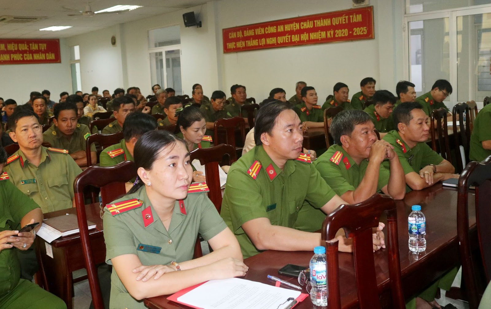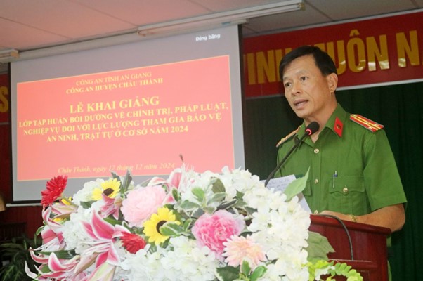 Sáng ngày 17/12/2024, Công an huyện Châu Thành tổ chức Lễ khai giảng lớp bồi dưỡng về chính trị, pháp luật, nghiệp vụ năm 2024 cho 63 học viên là Tổ trưởng Tổ bảo vệ an ninh, trật tự ở cơ sở trên địa bàn huyện. Đến dự và là báo cáo viên có Thượng tá Nguyễn Thanh Tùng - Phó trưởng Phòng PC02, Công an tỉnh An Giang. Cùng dự có đồng chí Lê Kỳ Quang - Phó Bí thư Huyện ủy - Chủ tịch UBND huyện Châu Thành; Các đồng chí lãnh đạo Công an huyện, Công an các xã, thị trấn.