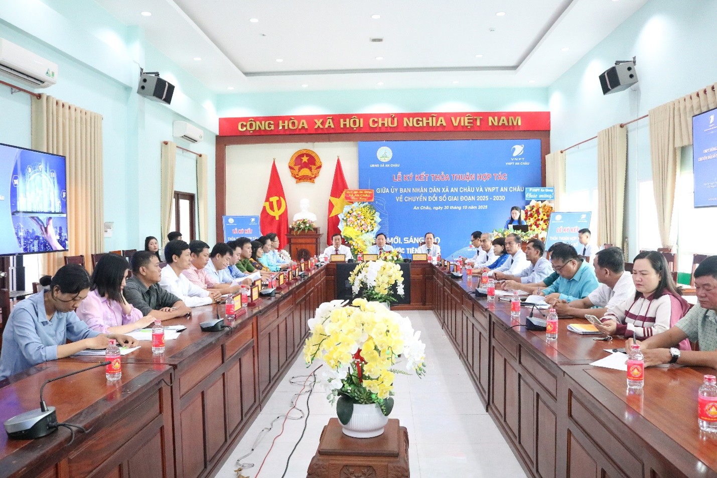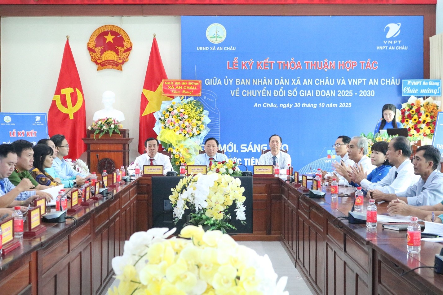 Nhằm đẩy mạnh công tác Chuyển đổi số trên địa bàn xã An Châu. Chiều ngày 30-10-2025, UBND xã An Châu và VNPT An Châu tổ chức Lễ ký kết thỏa thuận hợp tác Chuyển đổi số giai đoạn 2025-2030. Tham dự buổi lễ, về phía UBND xã có ông Lê Hồ Ngọc Trung – Phó Bí thư Thường trực Đảng ủy xã; ông Hồ Hữu Tài – Phó Bí thư Đảng ủy, Chủ tịch UBND xã; bà Phạm Thị Thu Dân – UVBTV Đảng ủy, Chủ tịch UBMTTQVN xã; bà Huỳnh Thị Thanh Tuyền – Phó Chủ tịch UBND xã;  về phía VNPT có ông Nguyễn Bá Mỹ An – Phó Giám đốc Trung tâm Kinh doanh giải pháp – VNPT An Giang; ông Nguyễn Ngọc Nhân – Giám đốc VNPT An Châu; ông Liêu Văn Liêm – Giám đốc Trung tâm Viễn thông An Châu; Lãnh đạo phòng, ban chuyên, các ấp trên địa bàn.
