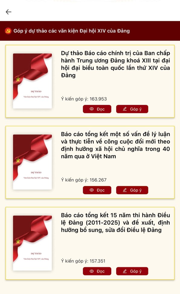 Bước 1: Người dân đăng nhập vào ứng dụng VNeID, tại màn hình trang chủ nhấn vào banner “Góp ý dự thảo văn kiện Đại hội Đảng”.