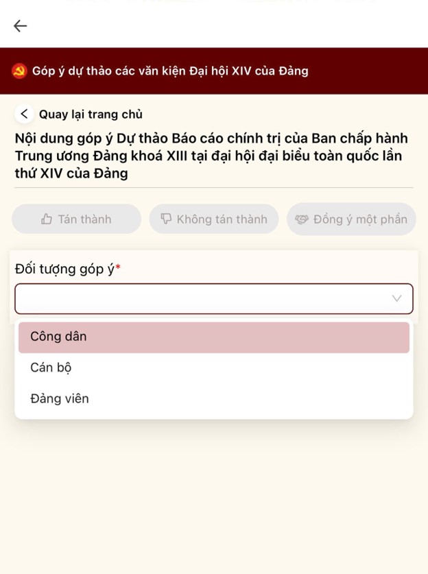 - Nếu đồng ý với toàn bộ nội dung dự thảo văn kiện: chọn “Tán thành”, sau đó chọn “Đối tượng góp ý” và nhấn “Gửi”.