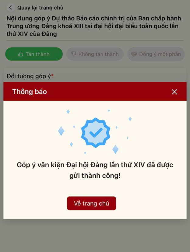 Bước 3: Màn hình hiển thị thông báo gửi góp ý về dự thảo các văn kiện Đại hội Đảng thành công. Nhấn “Về trang chủ” để quay lại màn hình danh sách dự thảo các văn kiện Đại hội.