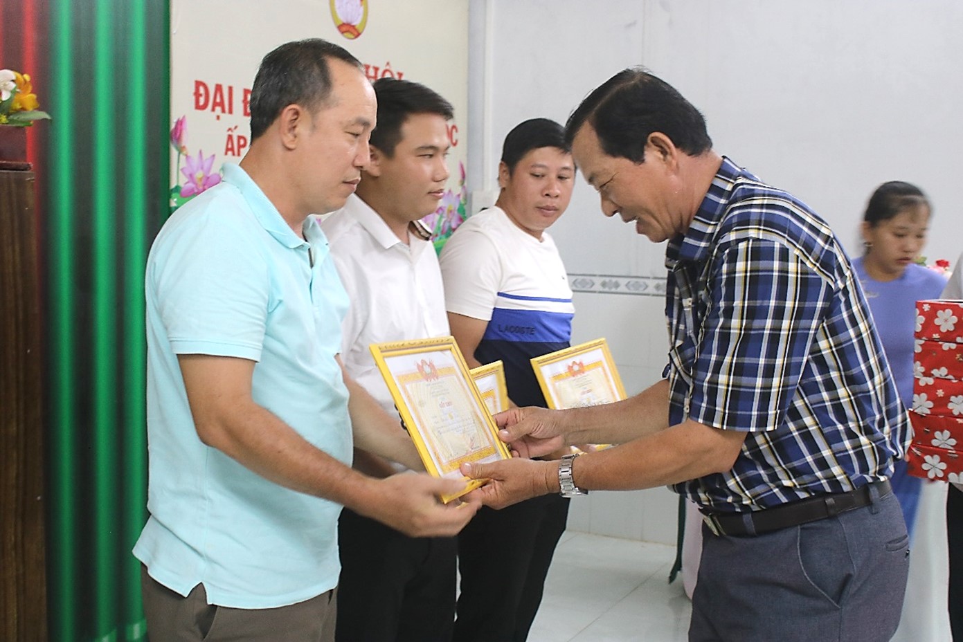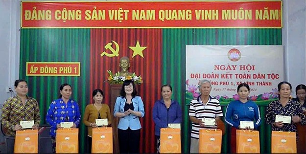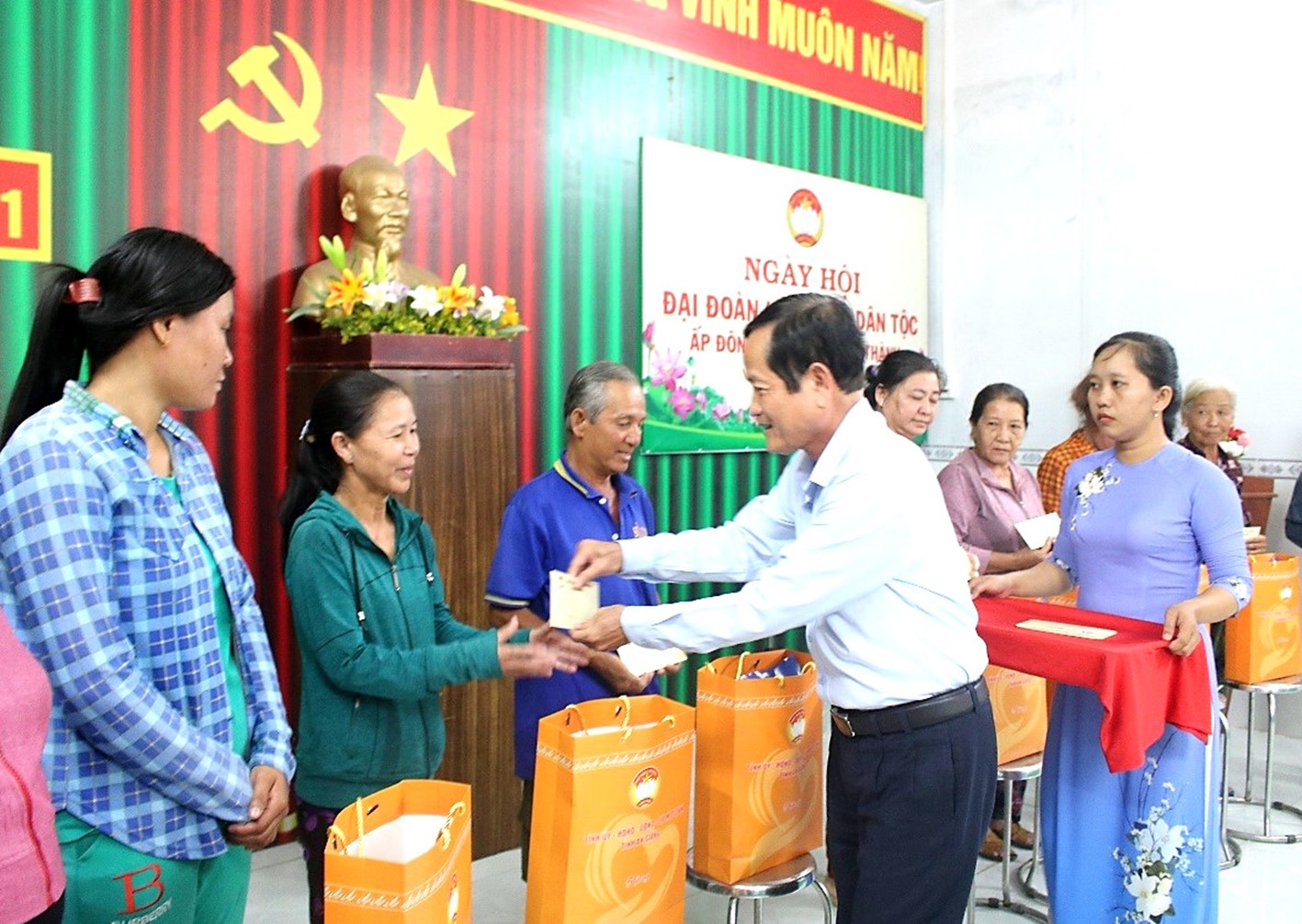 Dịp này, ông Đỗ Tấn Kiết - Ủy viên Ban Thường vụ Tỉnh ủy - Phó Chủ tịch Thường trực HĐND tỉnh đã trao tặng 20 suất quà. Mỗi suất trị giá 700 đồng cho các gia đình chính sách, hộ nghèo, hộ cận nghèo và hộ có hoàn cảnh khó khăn trên địa bàn. Ông Lê Kỳ Quang - Phó Bí thư Huyện ủy - Chủ tịch UBND huyện trao 10 suất quà. Mỗi suất 300 nghìn đồng tiền mặt cho hộ nghèo, hộ cận nghèo và hộ có hoàn cảnh khó khăn trên địa bàn ấp. Ủy ban MTTQ Việt Nam huyện trao 05 giấy khen, Ủy ban MTTQ Việt Nam xã Vĩnh Thành trao 03 giấy khen cho các cá nhân có thành tích xuất sắc trong thực hiện Cuộc vận động “Toàn dân đoàn kết, xây dựng Nông thôn mới, Đô thị văn minh” năm 2024.