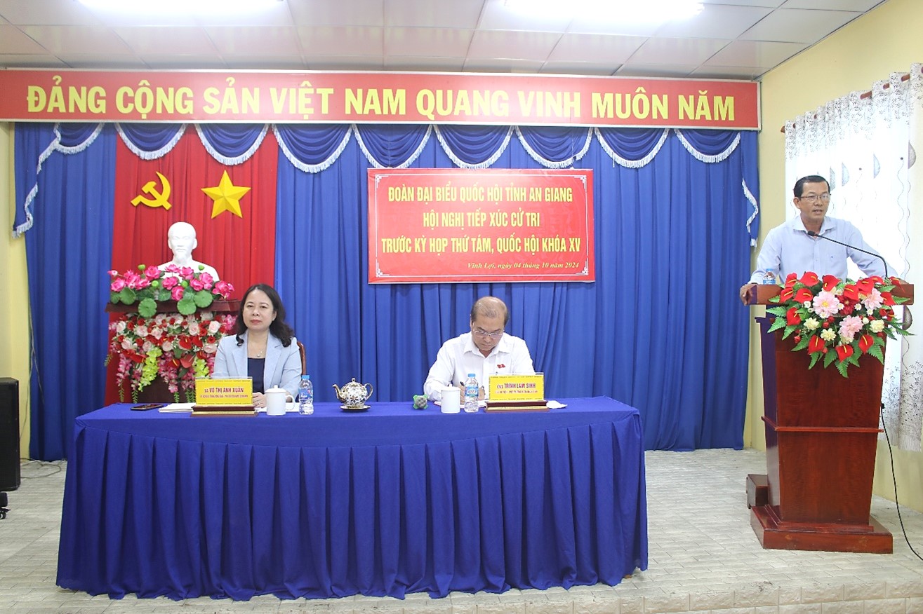 Phát biểu tại buổi tiếp xúc cử tri, Phó Chủ tịch nước Võ Thị Ánh Xuân đánh giá, một số ý kiến của cử tri rất tâm huyết, mang vấn đề lớn, chung của đất nước, nên Đoàn đại biểu Quốc hội tỉnh An Giang ghi nhận những kiến nghị của cử tri và trên từng góc độ công việc sẽ tiếp tục có những kiến nghị trong từng diễn đàn phù hợp. Đồng thời thông tin nhanh một số điểm sáng về phát triển kinh tế, văn hoá, xã hội của đất nước, tỉnh; công tác đối ngoại đạt nhiều hiệu quả cao, tạo được uy tín của Việt Nam trên trường quốc tế./.