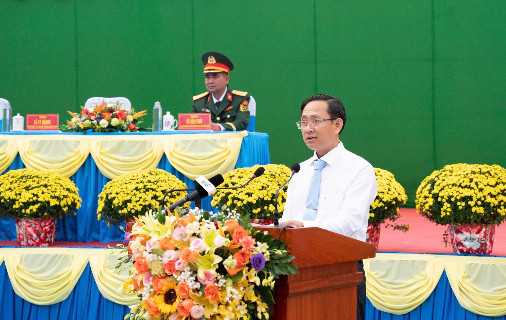 Tham dự buổi lễ có đồng chí Trung tướng Thái Đại Ngọc - Ủy viên Ban Chấp hành Trung ương Đảng, Ủy viên Quân ủy Trung ương, Phó Tổng Tham mưu trưởng Quân đội Nhân dân Việt Nam; đồng chí Thiếu tướng Hồ Văn Thái - Bí thư Đảng ủy, Chính ủy Quân khu 9; đồng chí Hồ Văn Mừng - Ủy viên Dự khuyết Ban Chấp hành Trung ương Đảng, Phó Bí thư Tỉnh ủy, Chủ tịch UBND tỉnh An Giang; đồng chí Đỗ Tấn Kiết - Ủy viên Ban Thường vụ Tỉnh ủy, Phó Chủ tịch HĐND tỉnh An Giang; lãnh đạo Bộ Chỉ huy Quân sự tỉnh; Công an tỉnh; Thường trực Huyện ủy, HĐND, UBND, Ủy ban MTTQ Việt Nam huyện; Thành viên Hội đồng nghĩa vụ Quân sự huyện; Đại diện lãnh đạo các đơn vị nhận quân; cùng 161 thanh niên và gia đình tham dự.