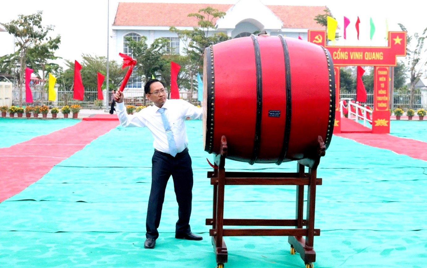 Đồng chí Lê Kỳ Quang - Phó Bí thư Huyện ủy, Chủ tịch UBND huyện, Chủ tịch Hội đồng Nghĩa vụ Quân sự huyện nổi hồi trống mở Hội giao quân