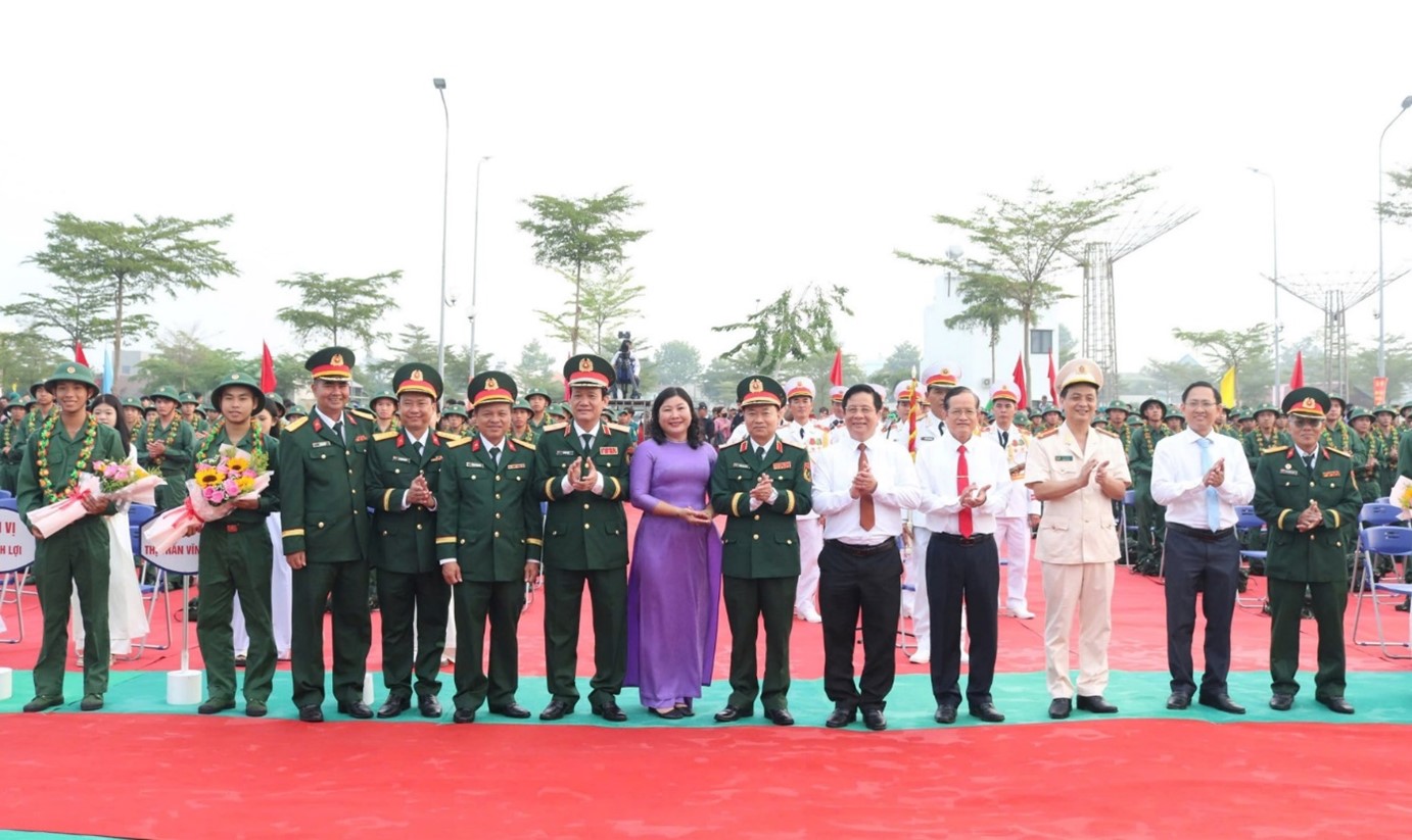 Lãnh đạo Bộ Tổng Tham mưu; lãnh đạo Quân khu 9; lãnh đạo tỉnh và huyện chụp hình lưu niệm cùng các tân binh
