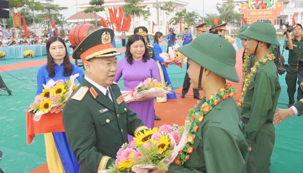 Đồng chí Trung tướng Thái Đại Ngọc - Ủy viên Ban Chấp hành Trung ương Đảng, Ủy viên Quân ủy Trung ương, Phó Tổng Tham mưu trưởng Quân đội Nhân dân Việt Nam tặng hoa chúc mừng các tân binh