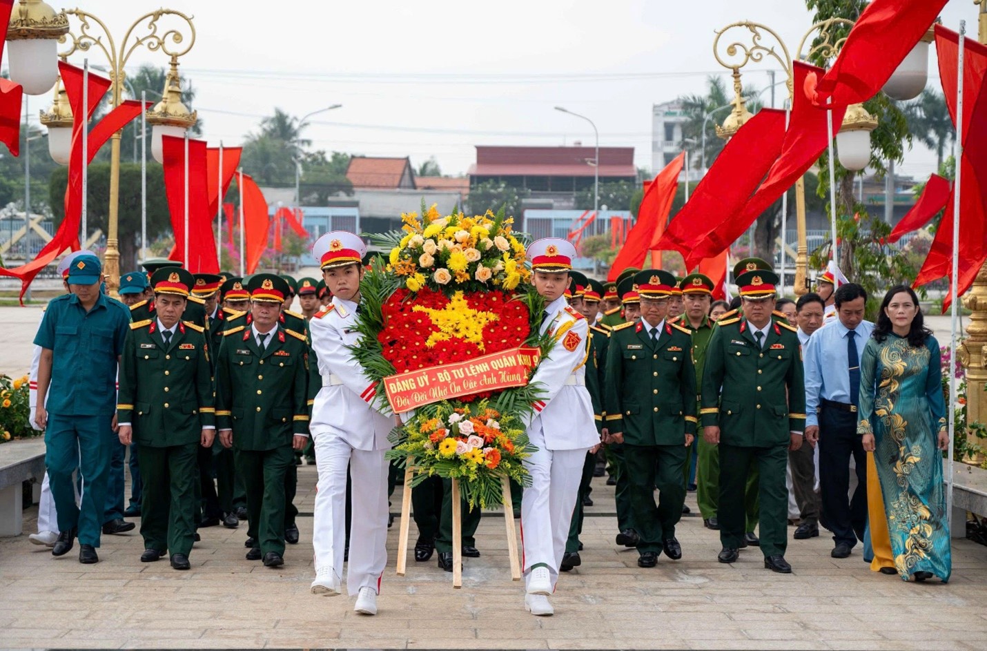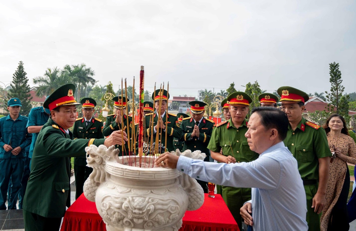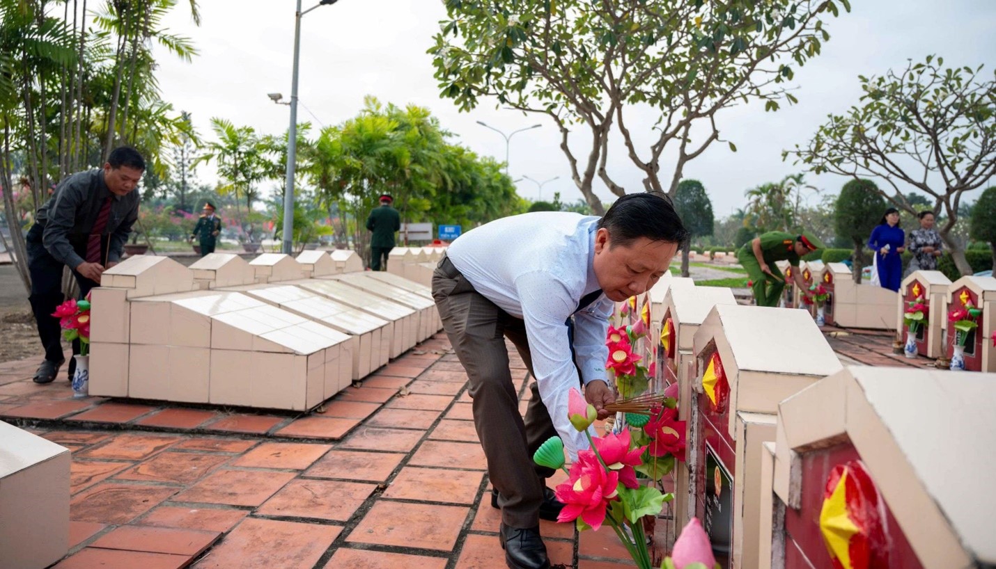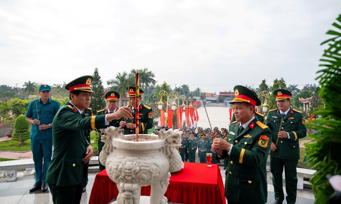 Trong không khí trang nghiêm, các đại biểu đã dâng hoa lên đài tưởng niệm, dành một phút mặc niệm và thắp hương lên phần mộ để bày tỏ lòng thành kính và biết ơn vô hạn đối với sự hy sinh to lớn của các Anh hùng liệt sĩ đã chiến đấu anh dũng hy sinh để bảo vệ Tổ quốc, giành độc lập cho dân tộc, đem lại tự do, hòa bình cho nhân dân.