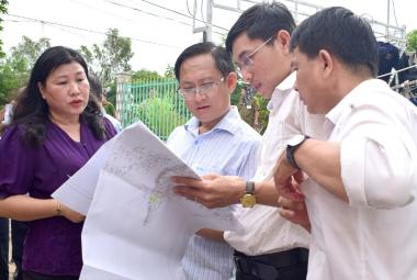 Bí thư Huyện ủy Châu Thành khảo sát thực tế tình hình thực hiện việc đền bù, giải phóng mặt bằng Dự án cao tốc đi qua địa bàn thị trấn Vĩnh Bình