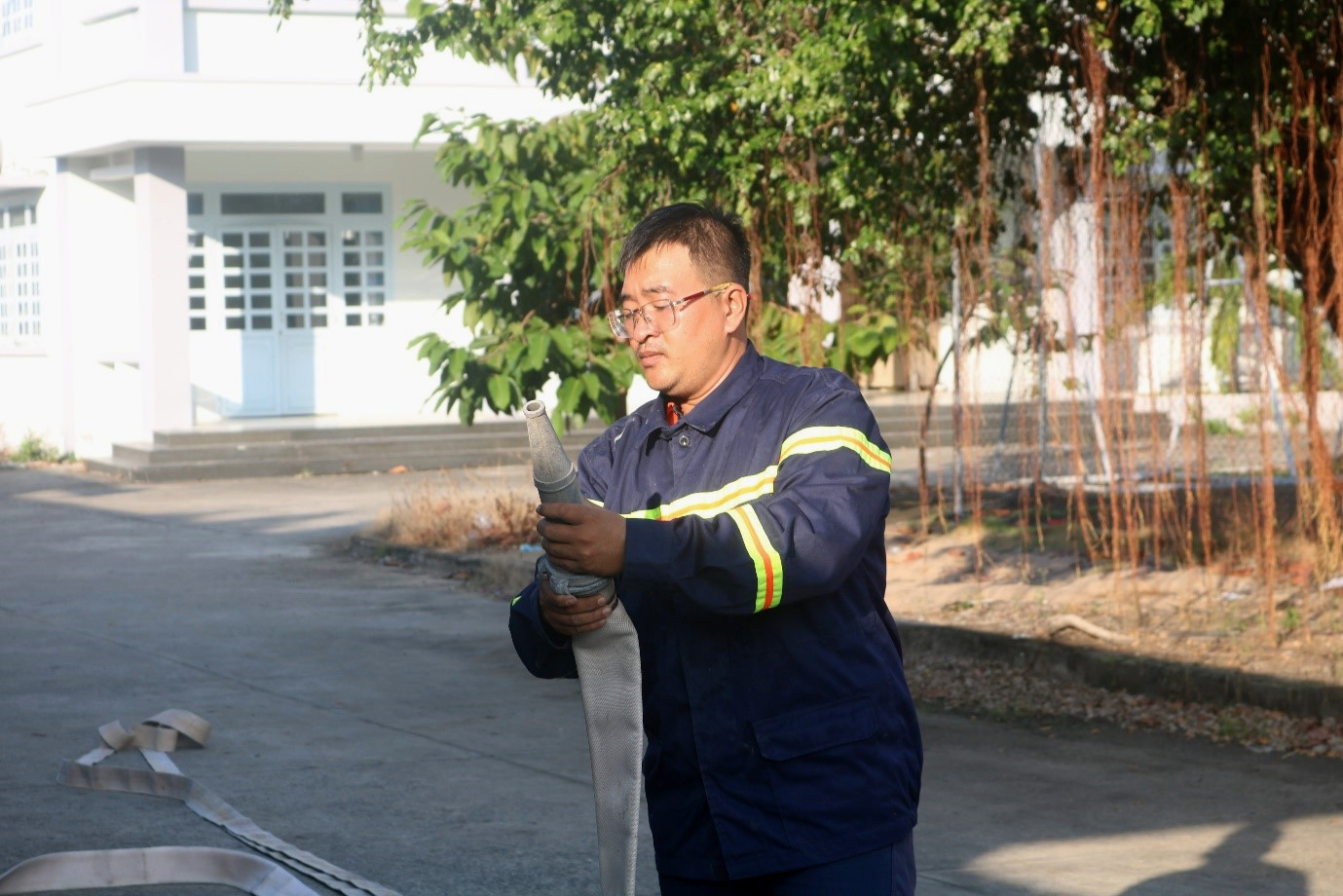 Báo cáo viên đang hướng dẫn học viên sử dụng ống chữa cháy