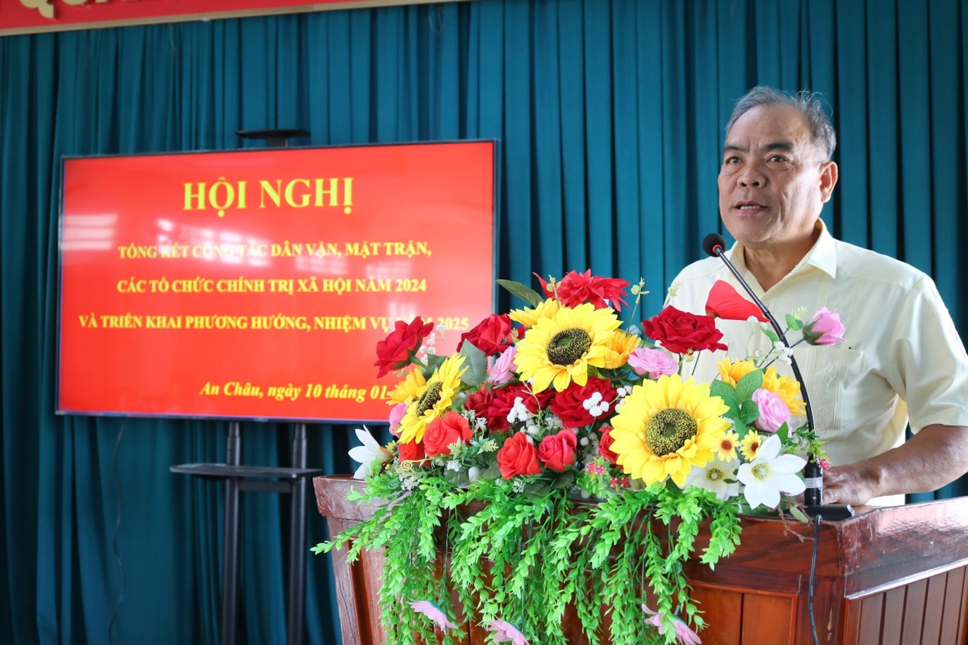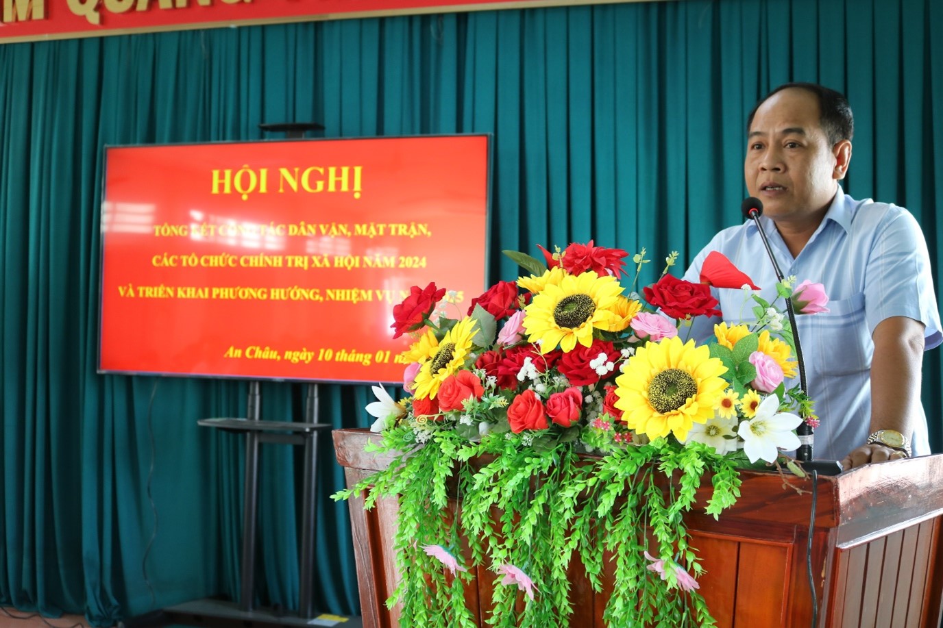 Phát biểu tại Hội nghị, đồng chí Đoàn Hồng Danh - Ủy viên Ban Thường vụ Huyện ủy, Trưởng Ban Dân vận Huyện ủy đã ghi nhận và biểu dương những kết quả trong công tác Dân vận, Mặt trận và các tổ chức chính trị - xã hội thị trấn An Châu năm 2024. Đồng thời, đồng chí Đoàn Hồng Danh đề nghị Khối Dân vận thị trấn cần bám sát các nhiệm vụ trọng tâm năm 2025; Tiếp tục tham mưu cấp ủy lãnh đạo, chỉ đạo công tác Dân vận chính quyền; Đổi mới, nâng cao chất lượng hoạt động của Khối Dân vận Đảng ủy, MTTQ và các Đoàn thể chính trị - xã hội, phát huy vai trò MTTQ và các đoàn thể chính trị - xã hội trong công tác giám sát và phản biện xã hội; Đẩy mạnh phong trào thi đua "Dân vận khéo" năm 2025...
