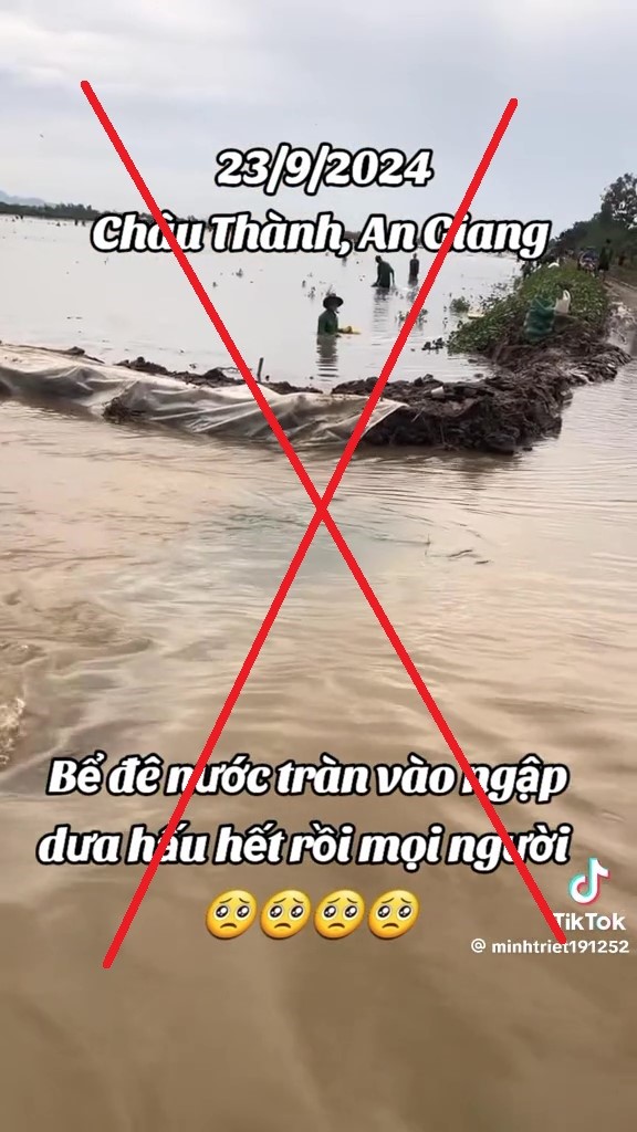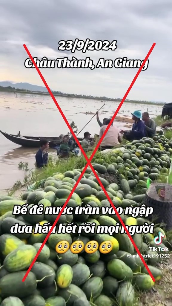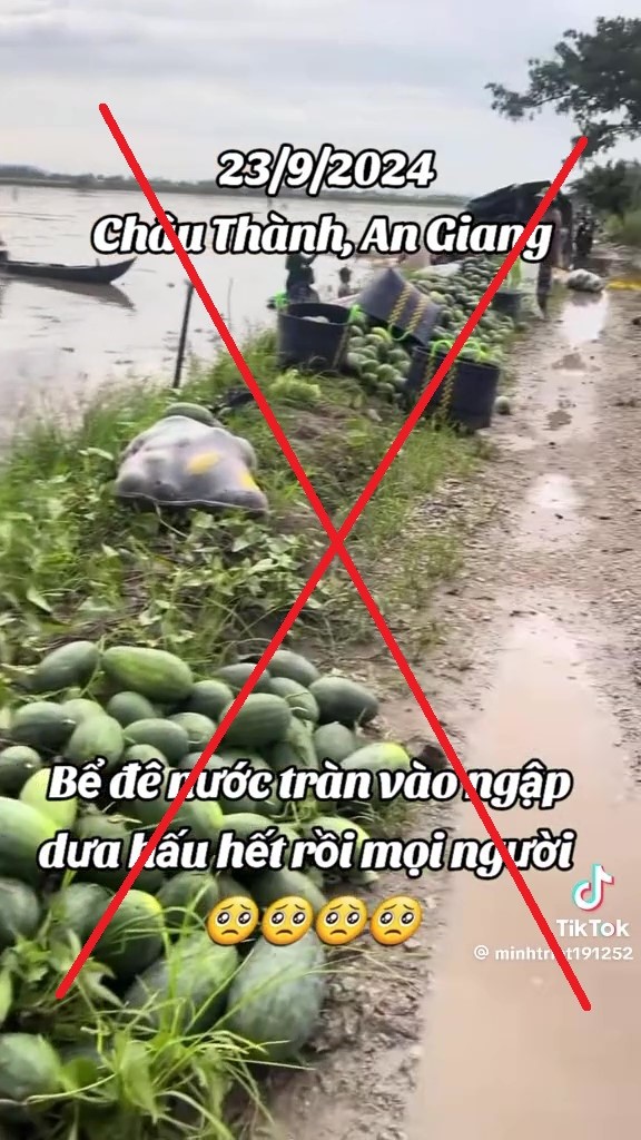 Thông tin “23/9/2024 Châu Thành, An Giang - Bể đê nước tràn vào ngập dưa hấu hết rồi mọi người” là thông tin sai sự thật