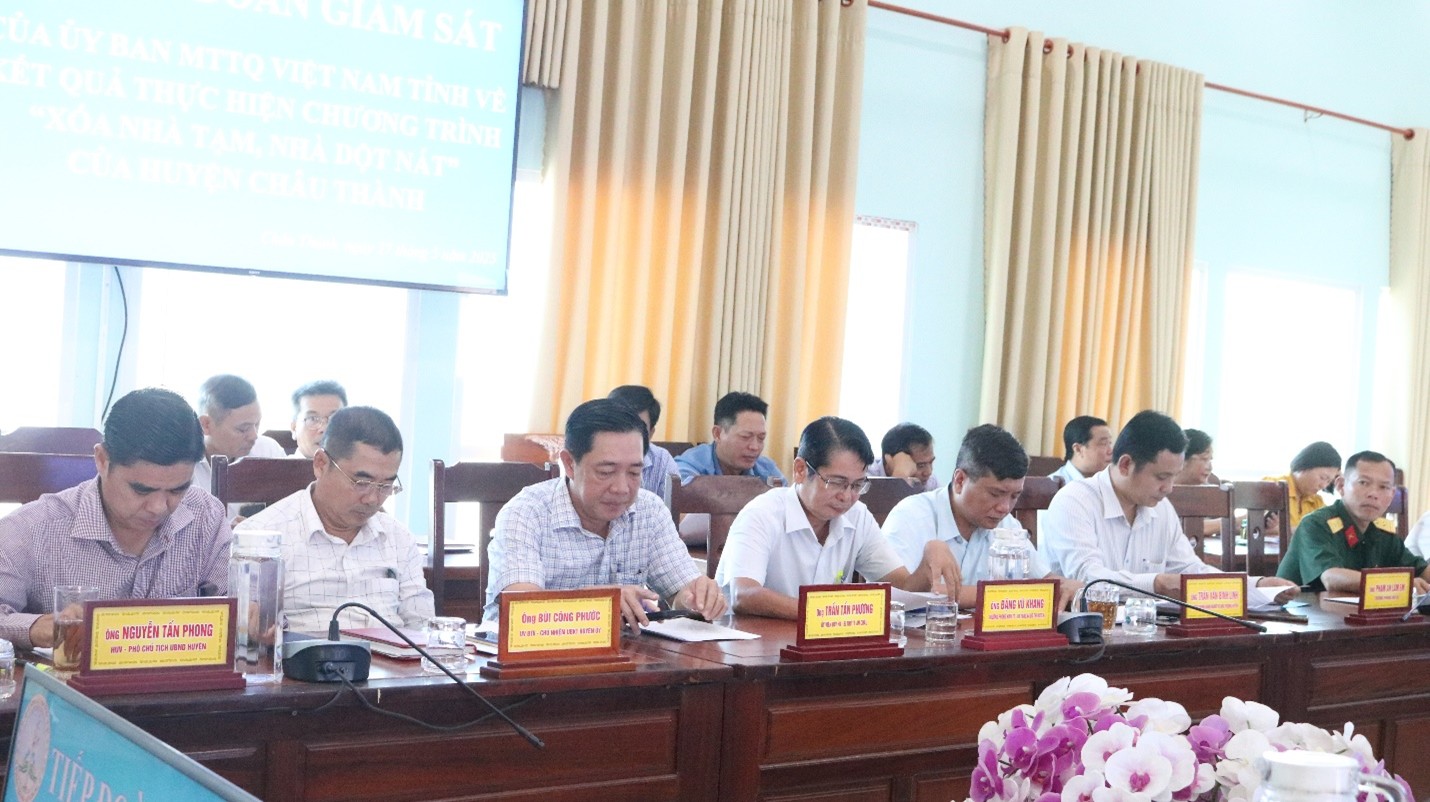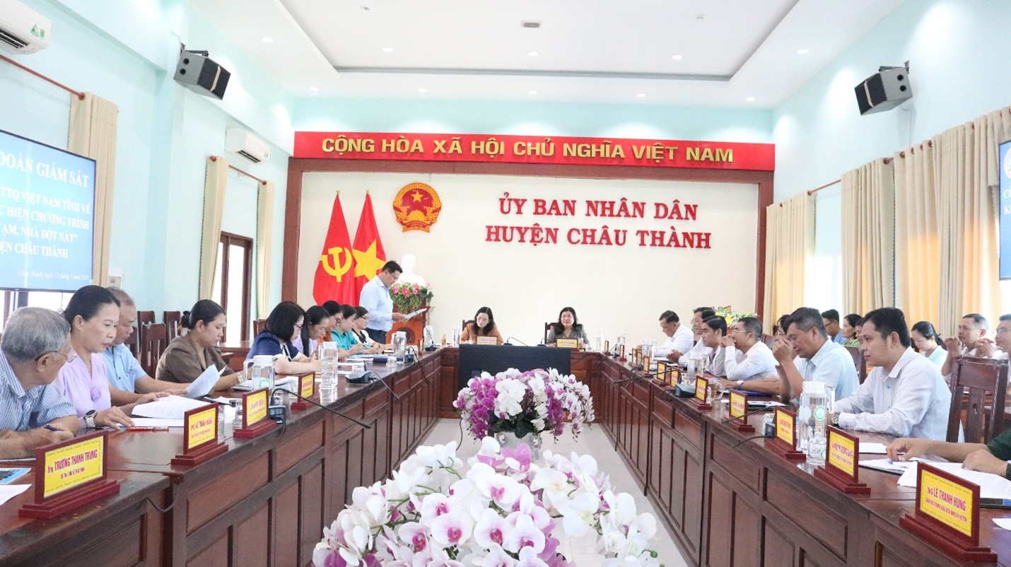 Ngày 27-05-2025, Ban Thường trực Ủy ban Mặt trận Tổ quốc Việt Nam tỉnh An Giang, do bà Đặng Thị Hoa Rây - Ủy viên Ban Thường vụ Tỉnh ủy, Chủ tịch Ủy ban Mặt trận Tổ quốc Việt Nam tỉnh An Giang làm Trưởng đoàn giám sát, đã có buổi làm việc với Ban Chỉ đạo xóa nhà tạm, nhà dột nát huyện Châu Thành về kết quả thực hiện Chương trình “Xóa nhà tạm, nhà dột nát” trên địa bàn huyện.