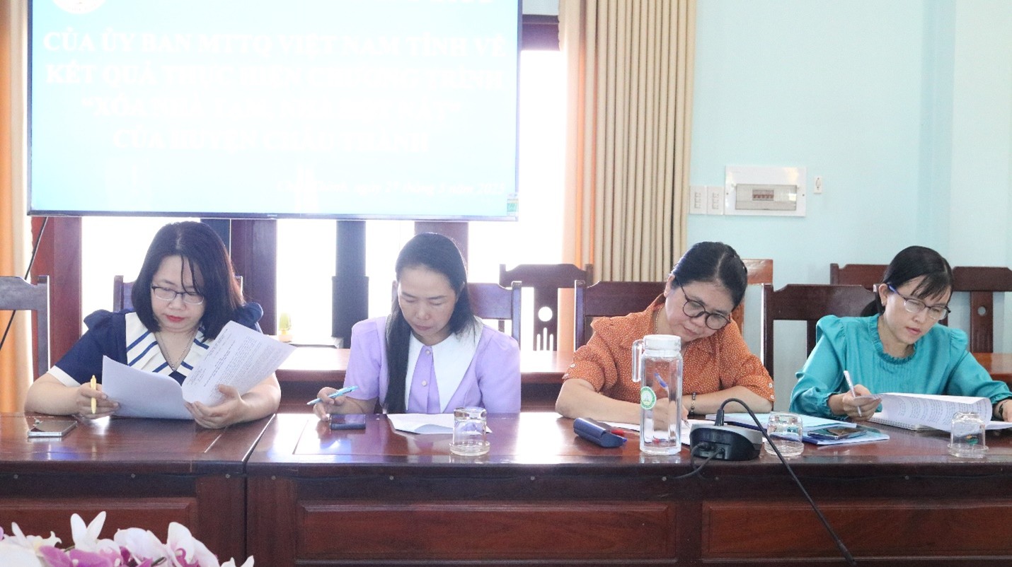 Tại buổi làm việc, Đại diện Ủy ban Mặt trận Tổ quốc Việt Nam tỉnh An Giang đã thông qua báo cáo kết quả giám sát Chương trình “Xóa nhà tạm, nhà dột nát” trên địa bàn huyện Châu Thành. Sau thời gian kiểm tra hồ sơ, khảo sát thực tế, Đoàn đánh giá cao công tác triển khai, tổ chức thực hiện của Ban Chỉ đạo huyện Châu Thành và Ban Chỉ đạo các xã, thị trấn trong việc triển khai, tổ chức thực hiện các văn bản của Trung ương, Tỉnh ủy, Ban Chỉ đạo tỉnh, các văn bản hướng dẫn, thi hành của Ủy ban nhân dân tỉnh và các Sở, Ngành chuyên môn.