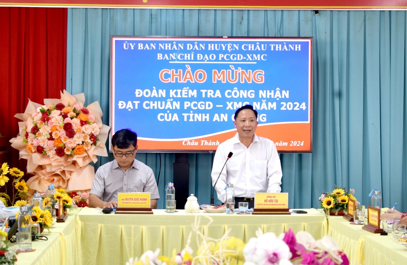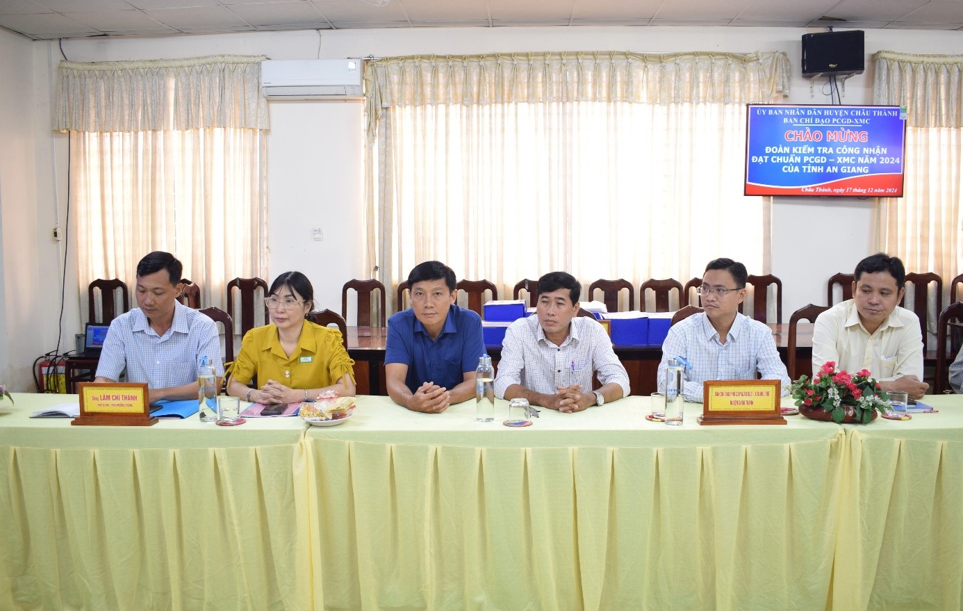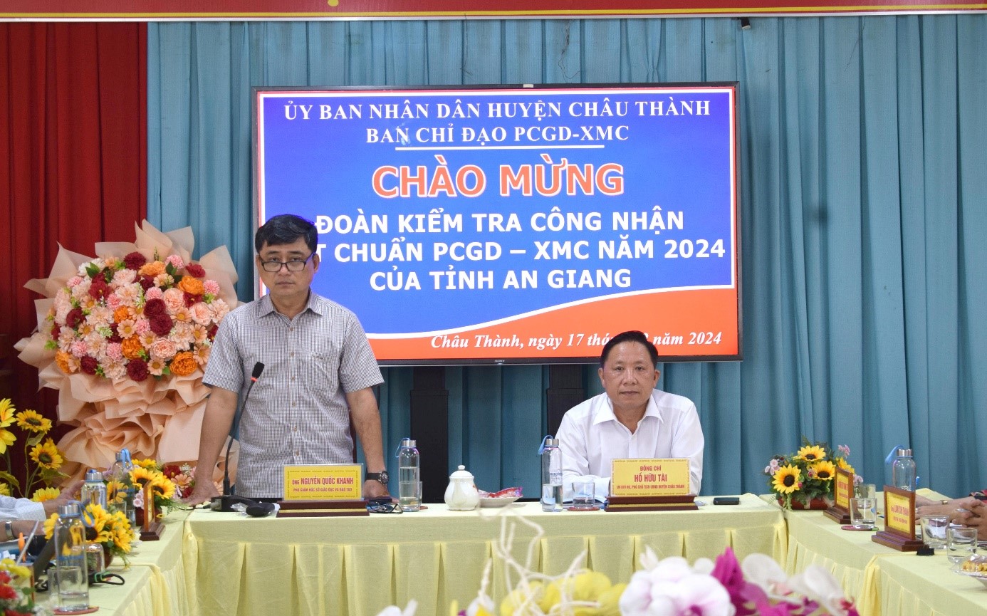 Ngày 17-12-2024, Ban Chỉ đạo Phổ cập giáo dục, Xóa mù chữ tỉnh An Giang đến kiểm tra công nhận đạt chuẩn Phổ cập giáo dục - Xóa mù chữ (PCGD – XMC) huyện Châu Thành năm 2024. Ông Nguyễn Quốc Khanh - Phó Giám đốc Sở Giáo dục và Đào tạo tỉnh An Giang, Trưởng đoàn kiểm tra. Tiếp và làm việc với Đoàn có ông Hồ Hữu Tài - Ủy viên Ban Thường vụ Huyện ủy, Phó Chủ tịch UBND huyện Châu Thành, Trưởng Ban Chỉ đạo PCGD - XMC huyện Châu Thành.