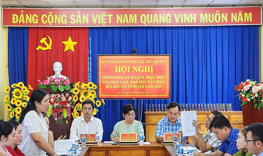 Sáng ngày 07-01-2025, UBND xã Vĩnh Lợi tổ chức Hội nghị triển khai thực hiện xóa nhà tạm, nhà dột nát trên địa bàn xã đến năm 2025. Tham dự Hội nghị có đồng chí Trần Thị Thanh Thuý - Huyện ủy viên, Bí thư Đảng ủy xã Vĩnh Lợi; Đồng chí Nguyễn Ngọc Đến - Phó Bí thư Thường trực Đảng ủy, Trưởng Khối Dân vận xã; Đồng chí Trương Hoà Lắm - Phó Bí thư Đảng ủy, Chủ tịch UBND xã.