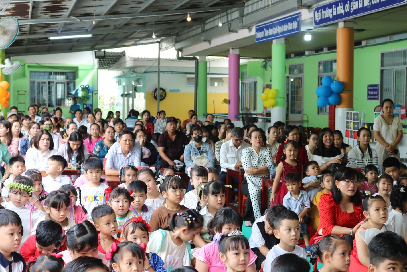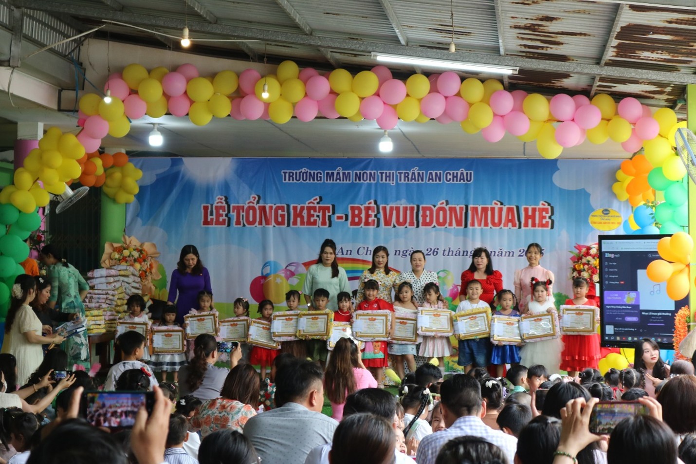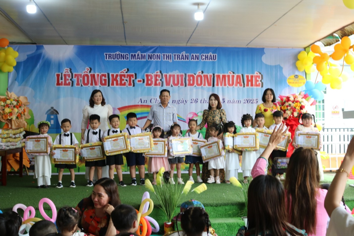 Tại đây, các đại biểu đã xem nhiều tiết mục ca múa nhạc do các em học sinh của trường biểu diễn tri ân các thầy, cô nhân ngày Lễ tổng kết năm học. Trong năm học qua, tập thể cán bộ, giáo viên nhà trường đã không ngừng nỗ lực, phấn đấu vươn lên và đạt nhiều thành tích đáng khích lệ. Trường đạt kiểm định chất lượng giáo dục mức 2 và đạt chuẩn Quốc gia mức 1, duy trì đạt chuẩn Phổ cập Mầm non cho trẻ em 5 tuổi. Trường thực hiện các hoạt động dạy học lấy trẻ làm trung tâm, ứng dụng công nghệ thông tin trong chuyên môn kết nối trực truyến trong sinh hoạt chuyên môn cùng cấp và liên cấp. Tổng số trẻ yêu cầu phát triển giáo dục, chất lượng trẻ 5 tuổi đạt 100%. Về chất lượng nuôi dưỡng, 100% trẻ em đến trường được theo dõi sức khỏe theo biểu đồ tăng trưởng, được khám sức khỏe định kỳ trong năm….